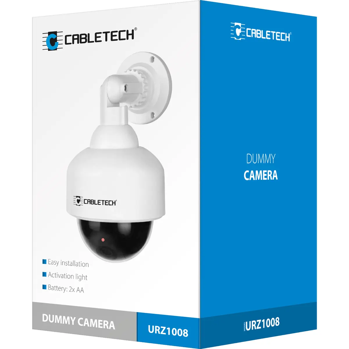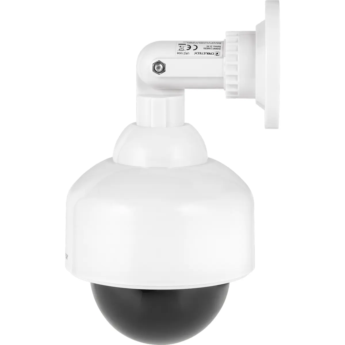 Câmara de vigilância dummy, de formato Dome com LED, alimentada por duas pilhas AA, com dimensões de 145x135x245mm e peso de 291g.