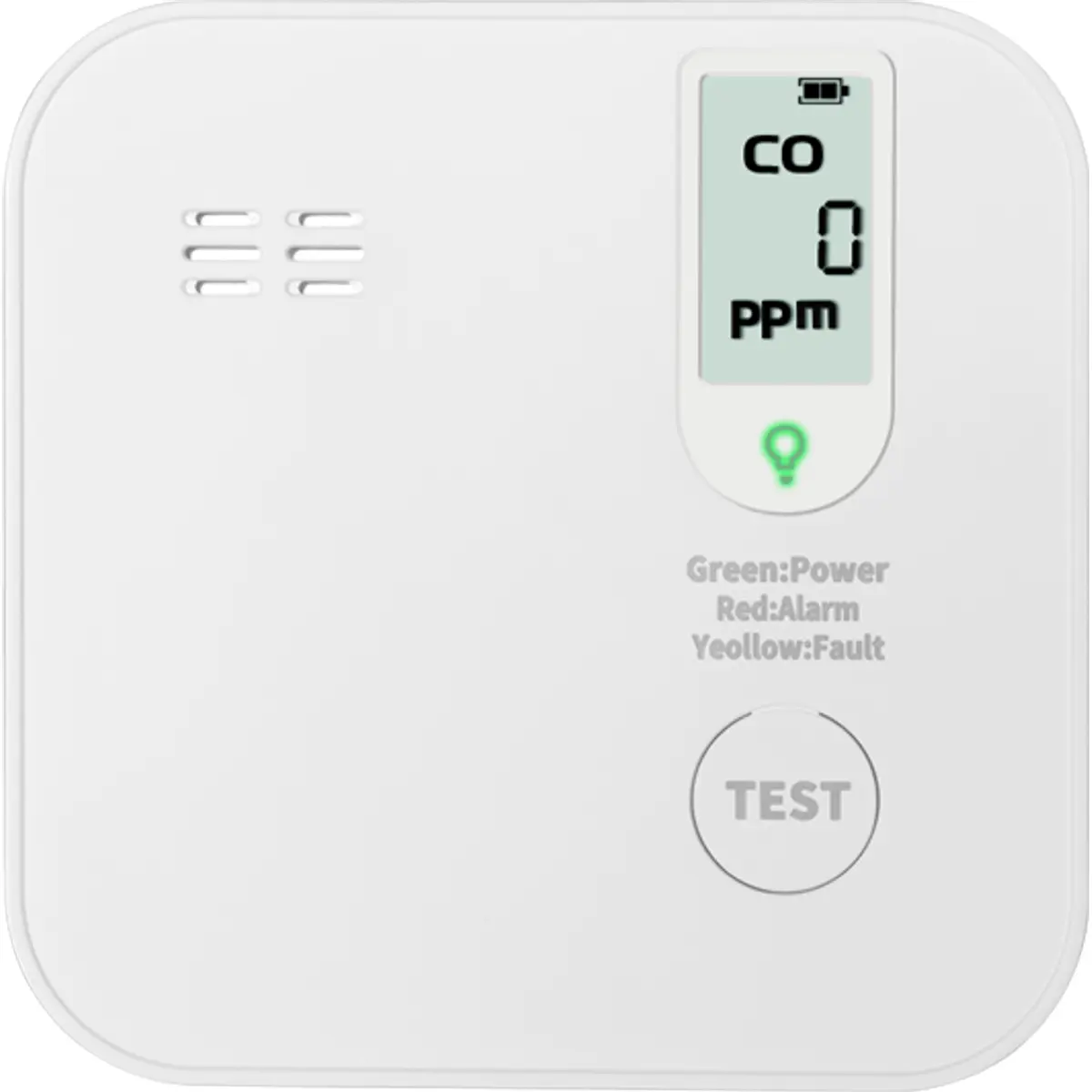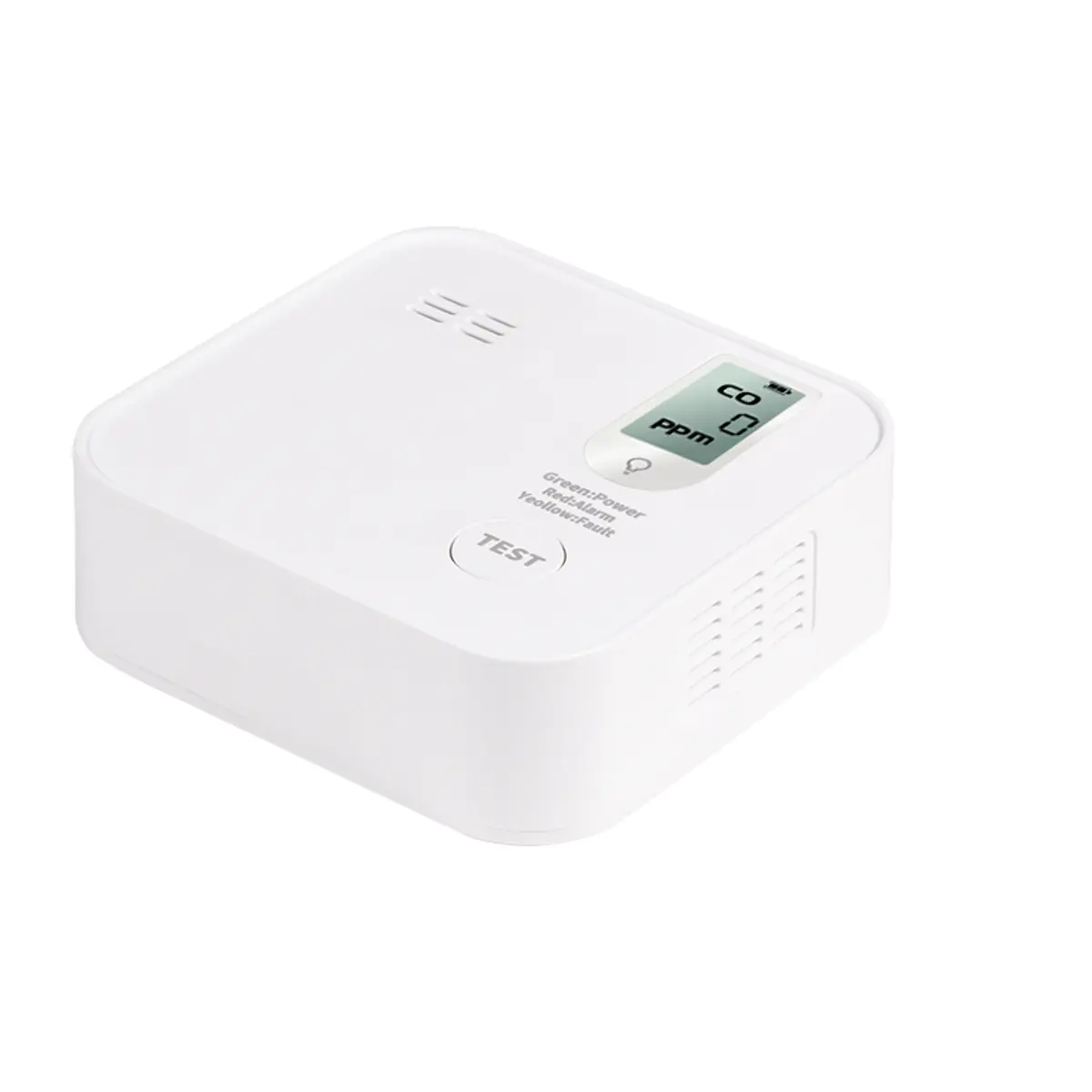 Detetor autónomo de monóxido de carbono com sensor eletroquímico, alimentação DC 3V (bateria CR123A). Emite alarme acústico de >=85 dB a 3 m e mostra os níveis de CO no LCD. Montagem em teto ou parede, com botão de teste e indicador LED. Vida útil da bateria e do sensor até 10 anos; certificado EN 50291-1:2018+AC:2021. Faixa de deteção 0-999 ppm, operação entre -10°C e 40°C e 0-95% RH.