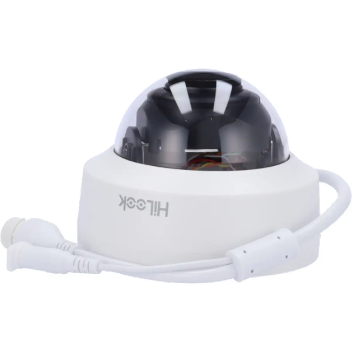 A câmara HiLook suporta Power over Ethernet (PoE), simplificando a instalação ao permitir alimentação e dados através de um único cabo Ethernet. Adicionalmente, conta com iluminação infravermelha para visão noturna até cerca de 30 metros, e o filtro IR-cut permite iluminação visível durante o dia para cores corretas, alternando automaticamente para a visão noturna quando necessário. O design tipo dome facilita a instalação no teto ou na parede, com possibilidade de ajuste de ângulo (pan/tilt) para posicionamento ideal. A compatibilidade com modernos sistemas de compressão como H.265 / H.265+ / H.264 / H.264+ permite reduzir o uso de largura de banda e armazenamento sem sacrificar a qualidade de imagem.