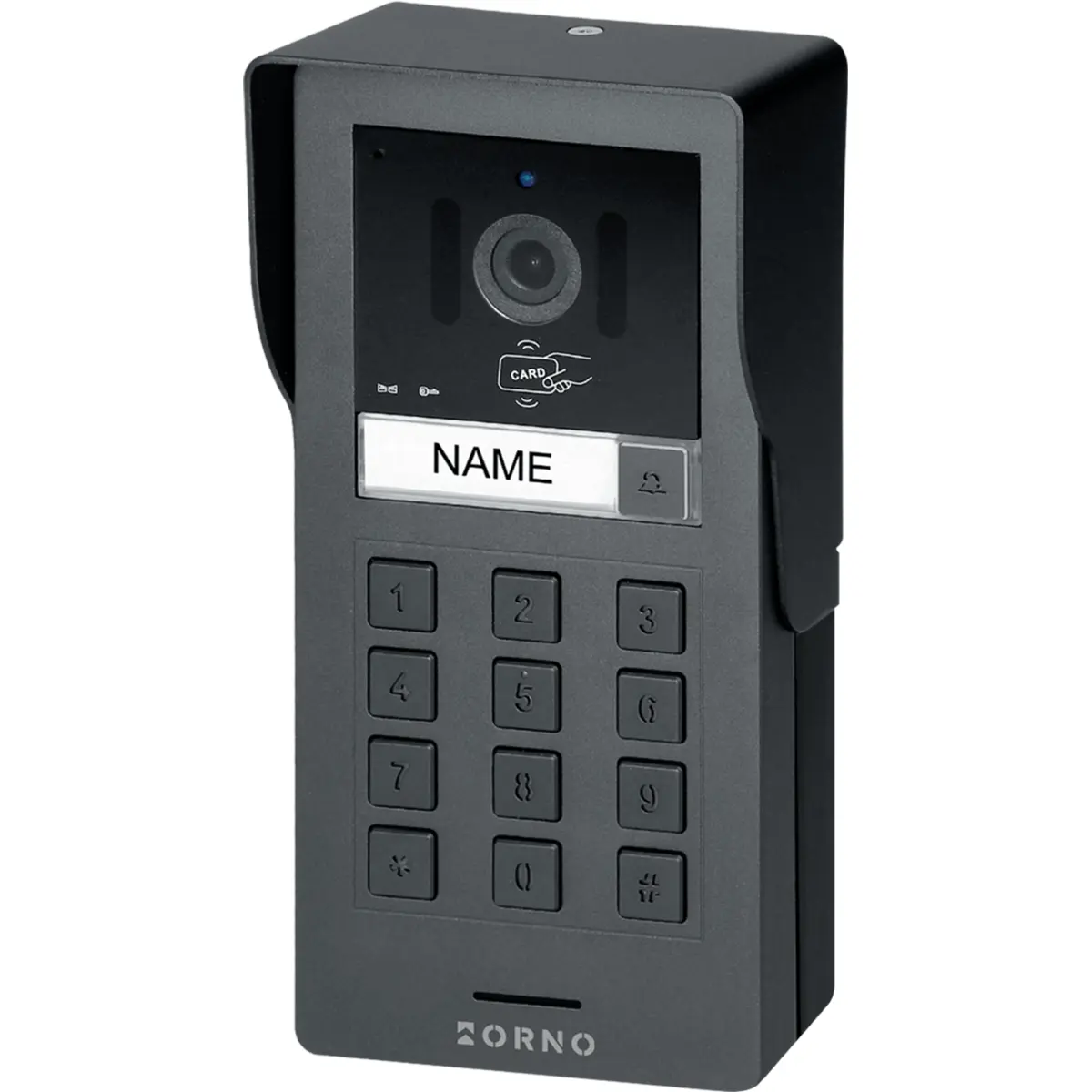 A unidade exterior possui câmara de 2 MP para fotos e vídeo Full HD, ângulo de visão de 105° horizontal e 52° vertical, iluminação IR para visão noturna (até 1 m), sensor de movimento, leitor de cartões RFID 125 kHz e teclado numérico. A unidade é em alumínio, antracite, com grau de proteção IP65 e pode ser montada à superfície ou embutida. Inclui 5 cartões/tags RFID.