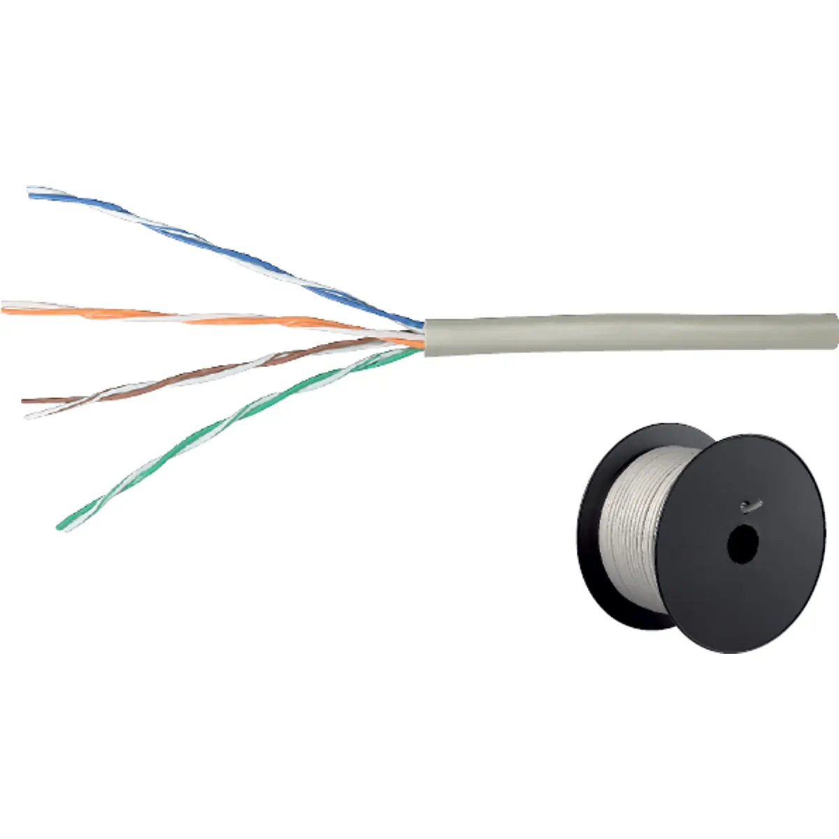 Cabo de rede CAT5e não blindado (UTP) com 4 pares, condutores AWG 26/7 e composição CCA; revestimento externo em PVC cinzento; diâmetro externo de aproximadamente 5 mm; impedância de 100 ohm e banda passante até 100 MHz; comprimento de 100 metros por bobine. Adequado para redes Ethernet em ambientes domésticos e empresariais, proporcionando ligações estáveis e compatíveis com padrões CAT5e.