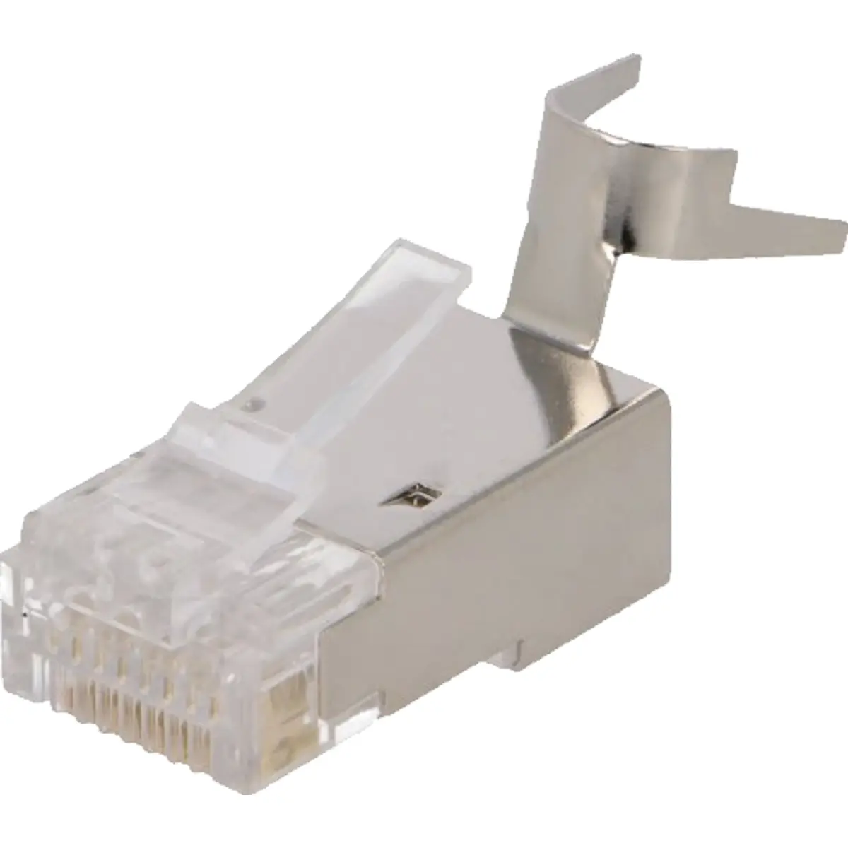 Conector RJ45 blindado para cravar (8P/8C) com ficha macho e guia, compatível com Cat 6a, Cat 7, Cat 7a e Cat 8.1. Montagem elétrica por cravar e montagem mecânica com cabo, apresentando 8 pinos e orientação simples. Ideal para ligações Ethernet seguras e confiáveis em redes de alta velocidade, oferecendo proteção contra interferências e uma terminação estável em cabos de rede com desempenho avançado.