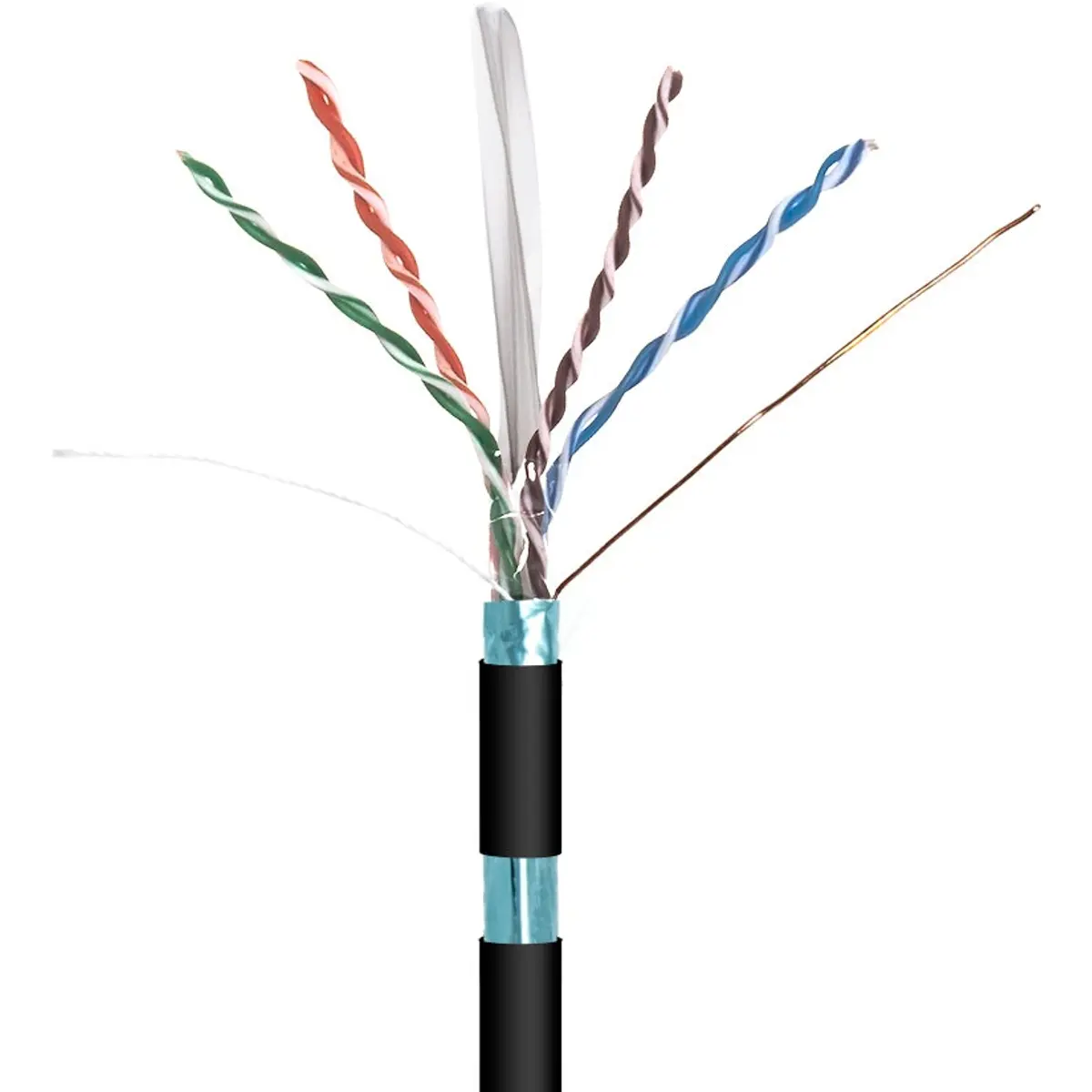 Cabo de rede CAT6 F/UTP para uso externo, com condutores unifilares em CCA e fio AWG23. Possui diâmetro de 6,2 mm e revestimento exterior em PE resistente a UV e água, em cor preta, com bobine de 100 m e 4 pares. Ideal para ligações de rede externas, oferecendo proteção contra intempéries e boa performance de transmissão.