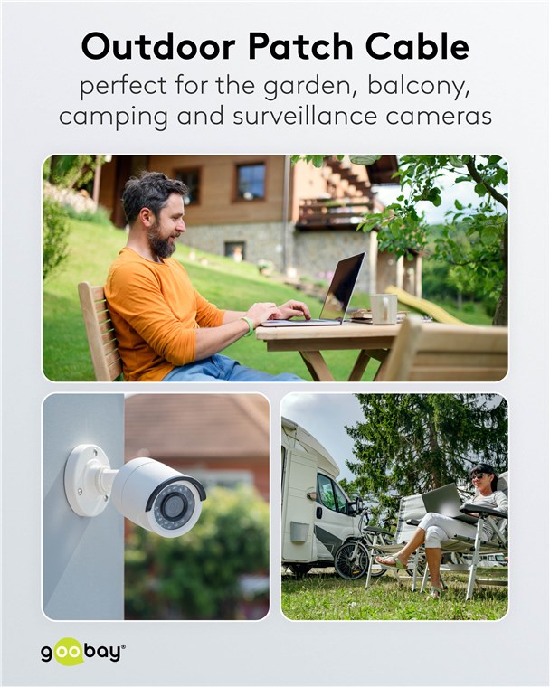 Ideal para uso ao ar livre, como em jardins, acampamentos, fachadas de edifícios e conexões de câmaras de vigilância. O revestimento de dupla camada em polietileno torna o cabo extremamente resistente às intempéries e à radiação UV.