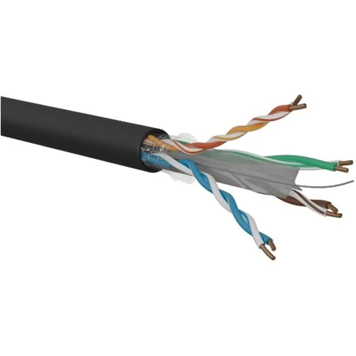 Cabo de rede UTP Cat6 para exterior, com 4 pares de cobre 24AWG, isolamento HDPE e bainha PVC preta. Impedância característica de 100 Ω ±5 Ω a 100 MHz, velocidade de propagação de 68% e transmissão até 1 Gbps, com frequência útil até 250 MHz. Ideal para cablagem horizontal de LAN, operando entre -30 °C e +70 °C, diâmetro externo de 6,3 mm e resistência à tração de até 10 kg.