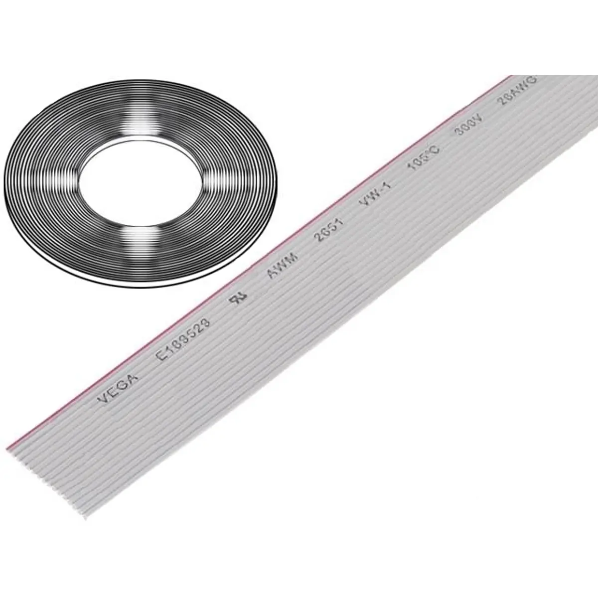 Fita flat-cable com 16 vias, largura de 1,27 mm e condutor Ø30AWG, fornecida em rolo de 30,5 m. Ideal para ligações multicondutoras entre componentes e placas, prototipagem e montagem de cablagem interna em dispositivos electrónicos. Compatível com conectores de fita plana, com tensão máxima de 300 V e boa flexibilidade para layouts compactos.