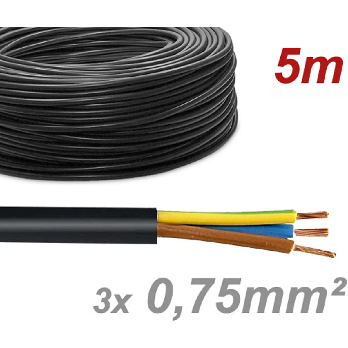 Cabo elétrico multifilar redondo FVV 3x0.75mm² preto - H05VV-F 3G0.75 (rolo de 5m)