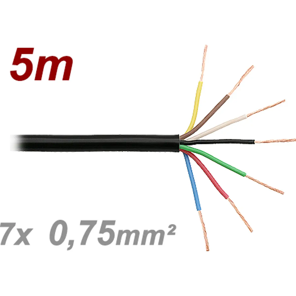 Este cabo multi-condutor flexível de 7x0.75mm², com 5 m de comprimento e tensão nominal de 24V, é indicado para a alimentação elétrica de estruturas engatadas (caravanas, reboques, porta-bicicletas com chapa iluminada).