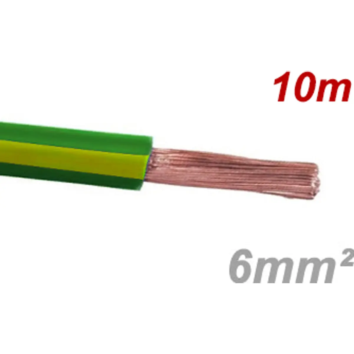Fio elétrico multifilar verde/amarelo, com condutor de cobre flexível e isolamento em PVC, destinado a instalações elétricas internas. Possui diâmetro externo de 4,6 mm e secção nominal de 6 mm², suportando tensão de 450/750 V. Oferece boa flexibilidade com raio mínimo de curvatura de 45 mm, ideal para ligações em ambientes residenciais e profissionais. Geralmente fornecido em rolos de 10 m, este cabo proporciona segurança, durabilidade e facilidade de manuseamento, mantendo conformidade com normas de isolamento elétrico.