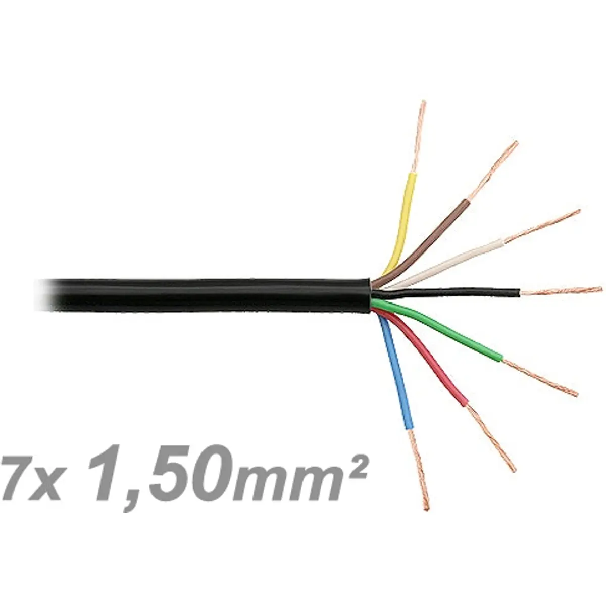 Este cabo multi-condutor flexível de 7x1,5 mm² é adequado para alimentação eléctrica de estruturas engatadas, como caravanas, reboques e porta-bicicletas com chapa iluminada. Disponível em rolo de 100 metros, tem tensão nominal de 24V e secção de 7x1,5 mm², garantindo condução estável de energia. Ideal para ligações internas e externas, oferece boa flexibilidade, instalação fácil e fiabilidade, assegurando desempenho eficaz em instalações móveis.