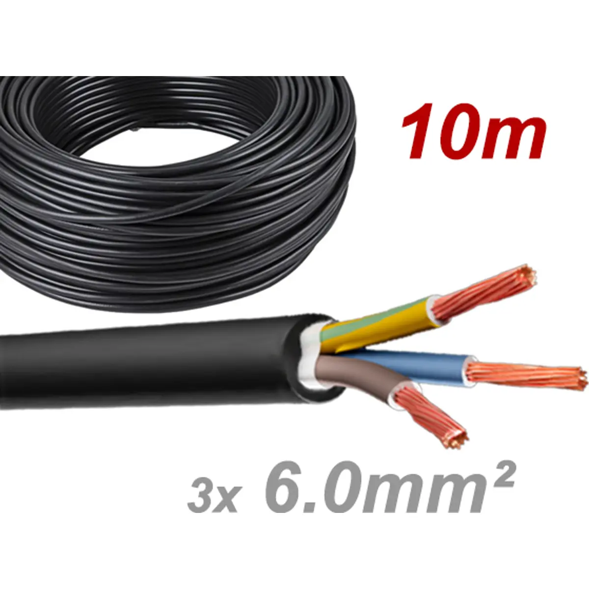 Cabo elétrico multifilar redondo com isolamento XLPE (polietileno) e revestimento externo em PVC. O condutor é cobre multifilar, com secção de 6 mm², oferecendo boa capacidade de transmissão e flexibilidade. Possui três condutores, diâmetro exterior de Ø11,95mm e comprimento de 10m, sendo adequado para ligações elétricas em instalações internas. A cor preta facilita a coordenação de cablagem, com resistência e durabilidade compatíveis com usos domésticos e profissionais.