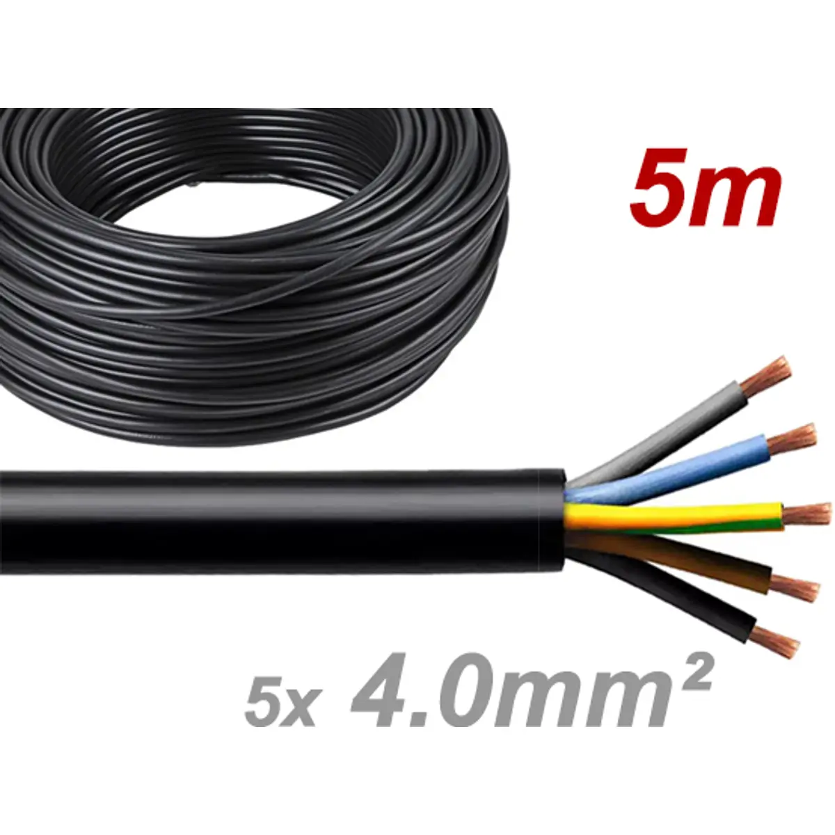 Este cabo elétrico multifilar redondo, com revestimento exterior PVC e isolamento XLPE polietileno, possui condutor de cobre multifilar e 5 condutores, com secção de 4mm² e diâmetro exterior de Ø12,90mm. É preto e tem comprimento de 5m; classificado como cabo RV-K. Ideal para ligações elétricas que exigem um cabo compacto, com boa tolerância e robustez de isolamento, adequado para ambientes onde se utilize este tipo de construção.