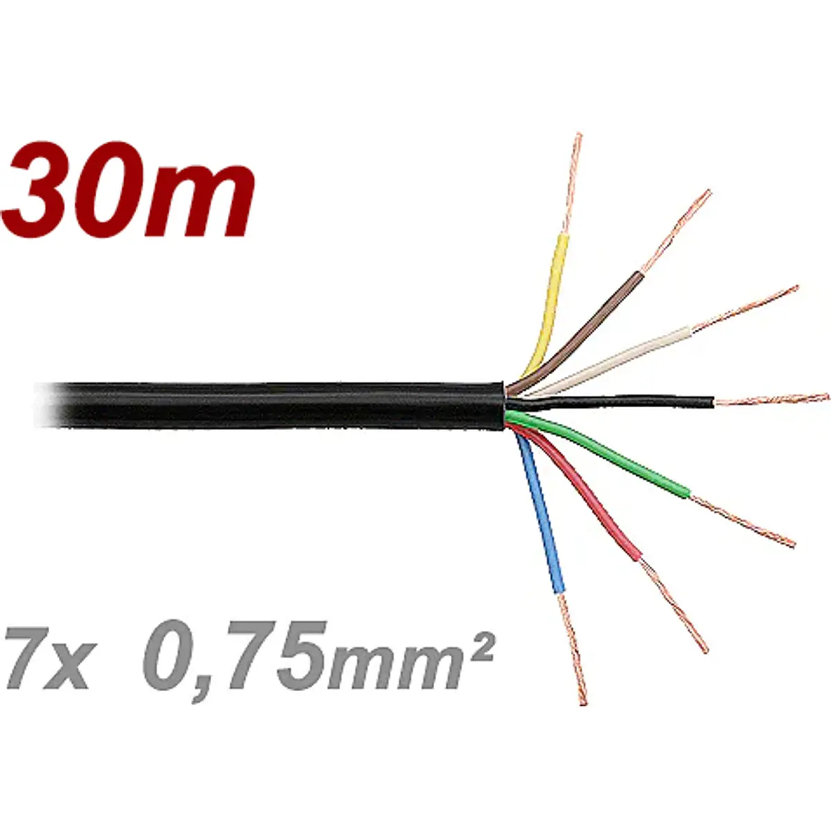 Este cabo multi-condutor flexível é de cobre, com secção 7x0.75mm² e tensão nominal de 24V, fornecido em rolo de 30m. Destina-se à alimentação eléctrica de estruturas engatadas, como caravanas, reboques e portas-bicicletas com iluminação. A construção flexível facilita a instalação em traçados curvos, assegurando condução estável de energia em sistemas de 24V. Adequado para ligações elétricas em veículos e equipamentos móveis, oferecendo fiabilidade em ligações de curta a média distância.
