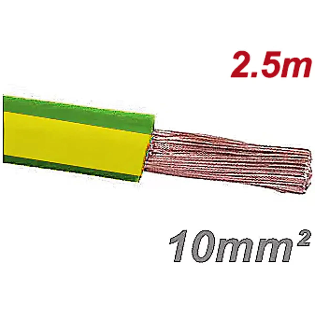 Fio elétrico multifilar H07V-K, 10mm², verde/amarelo, em rolo de 2.5 m, com isolamento de 1 mm e diâmetro Ø6.1 mm. O peso aproximado é de 110 kg por quilómetro. A resistência DC máxima é de 1,91 Ω/km a 20 °C; a corrente máxima em ar a 30 °C é de 50 A. A queda de tensão é de 3,759 V/A.km (cos φ 0,8).