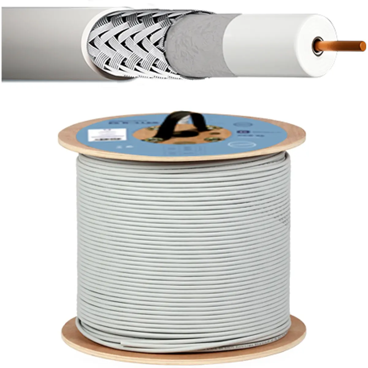 Cabo coaxial de 75 Ω RG6 com condutor CCS, dielétrico de espuma física e lâmina/malha; cobertura LSZH, cor branca. Apresenta atenuação de 4,7 dB a 50 MHz até 33,9 dB a 3000 MHz e blindagem de 90 dB (5–1000 MHz), 85 dB (1000–2400 MHz) e 75 dB (3000 MHz). Embalado em bobina de madeira de 250 m para instalações de telecomunicações, vídeo e redes.