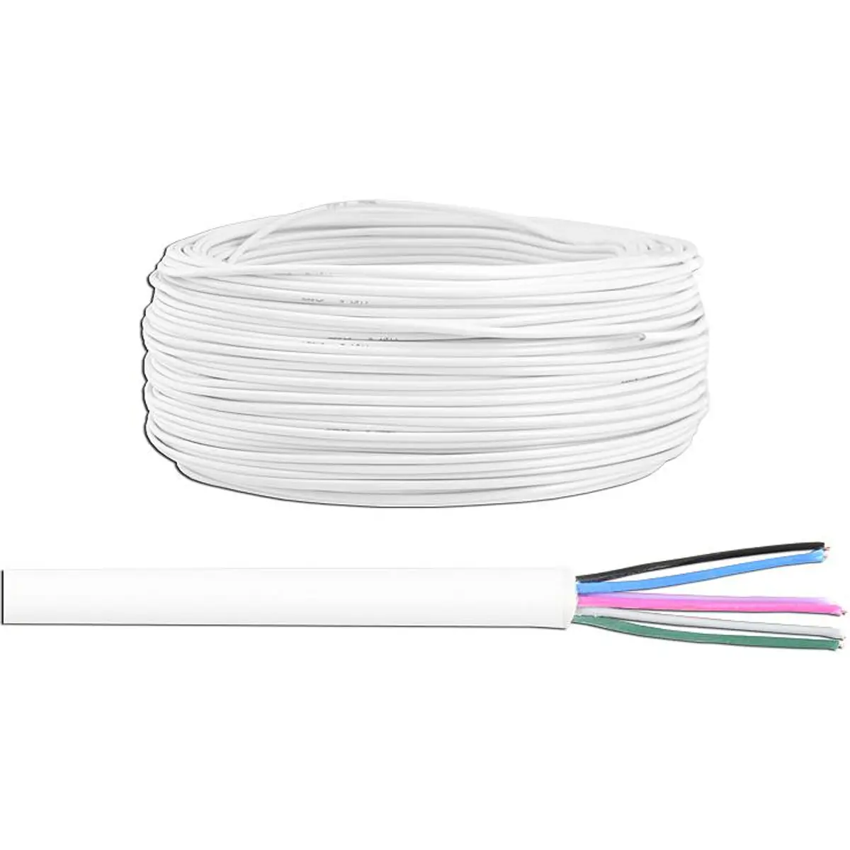 Cabo de instalação interior de baixa tensão com seis condutores em CCA de 0,5mm², comprimento de 100 m, isolamento exterior em PVC e cobertura branca. Compatível com sistemas de sinalização, alarme, videoporteiro e automação, bem como transmissão de dados. Oferece flexibilidade e facilidade de instalação para redes internas, com boa condução em DC e aplicação em ambientes residenciais e comerciais.