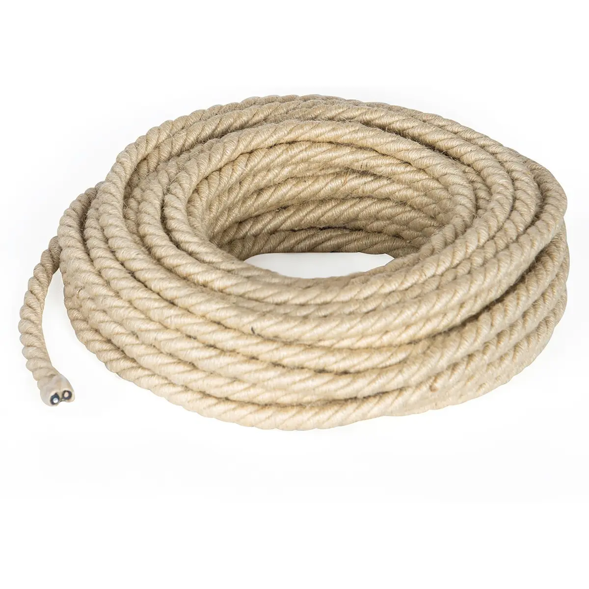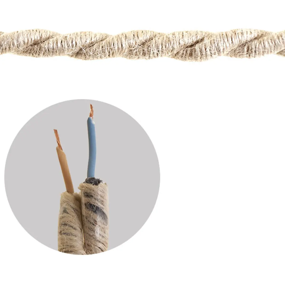 Cabo flexível com revestimento têxtil tipo corda de juta, ideal para projetos de iluminação decorativa em ambientes interiores. Combina estética rústica com funcionalidade, sendo indicado para instalações móveis no interior de habitações. É especialmente utilizado na cablagem de candeeiros suspensos, luminárias vintage e outros dispositivos de iluminação.