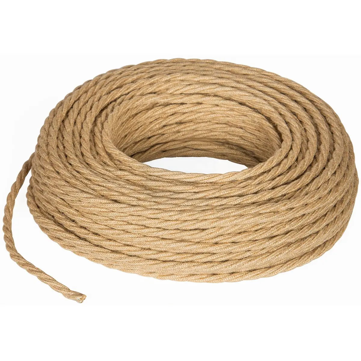 Cabo flexível com revestimento têxtil tipo corda de juta, ideal para projetos de iluminação decorativa em ambientes interiores. Combina estética rústica com funcionalidade, sendo indicado para instalações móveis no interior de habitações. É especialmente utilizado na cablagem de candeeiros suspensos, luminárias vintage e outros dispositivos de iluminação.