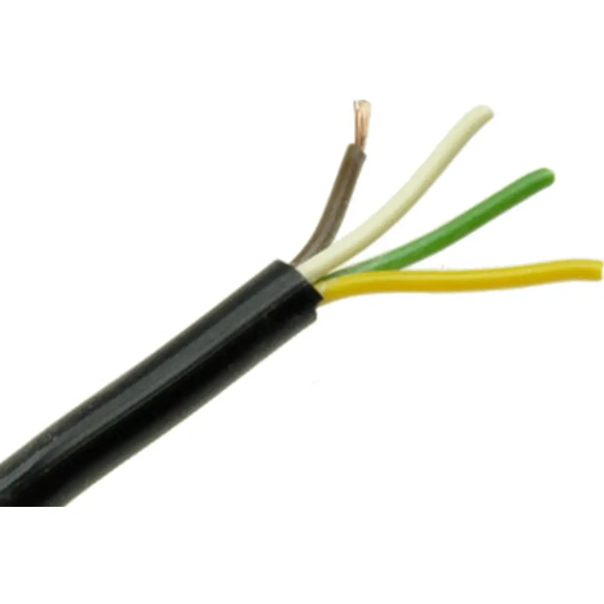 O cabo multifilar, com quatro condutores de 0,14 mm² e isolamento em PVC preto, tem diâmetro externo de 3,4 mm e tensão nominal de 300 V. Destina-se a automação, controlo de máquinas, electrónica industrial e transmissão de dados, apresentando resistência a óleo, funcionamento entre -40 °C e 80 °C, não propaga chamas e sem blindagem. As cores do isolamento são distintas, com marcação a cores, sem repetições.