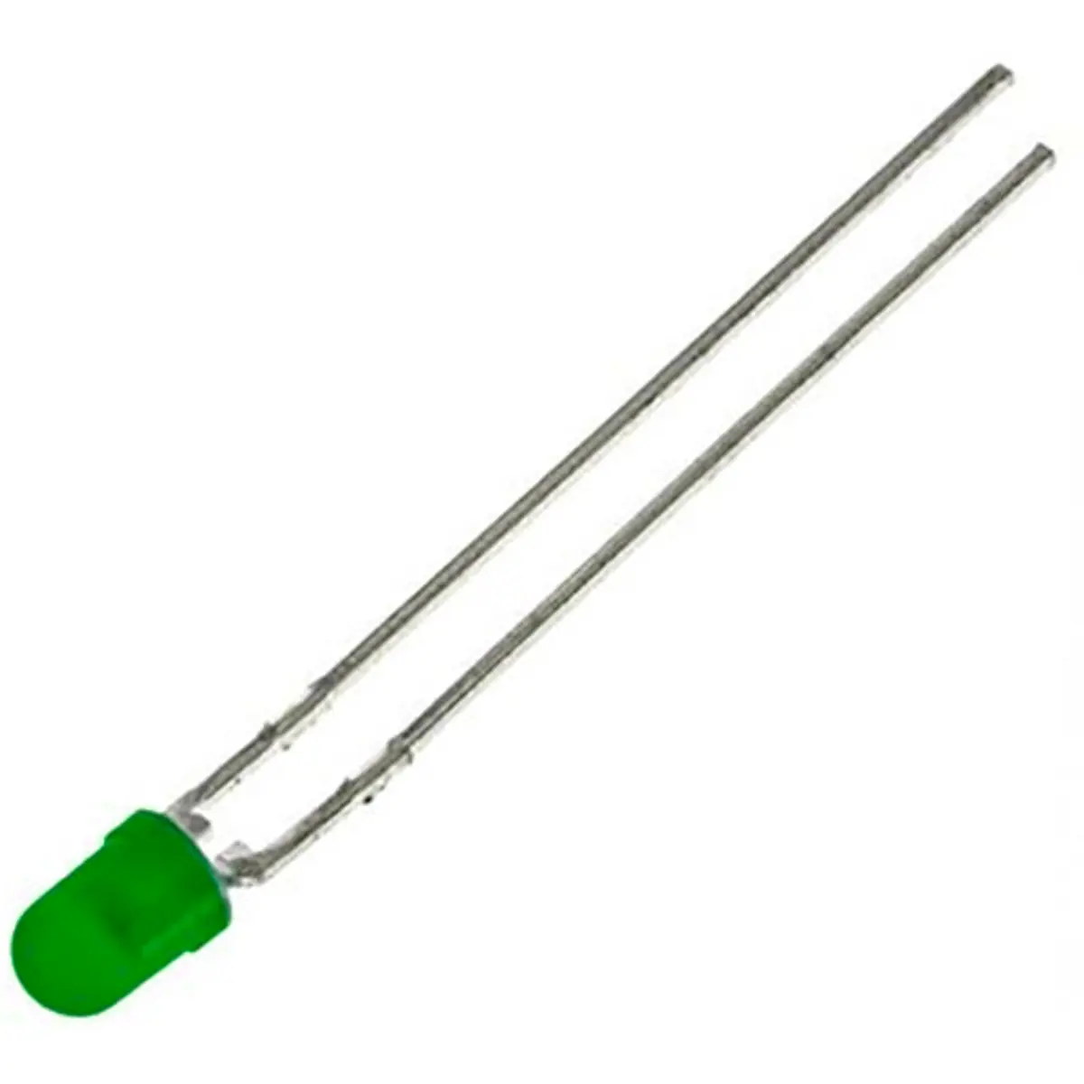 LED verde de 3 mm com luminosidade de 20 mcd, ângulo de abertura de 30°, e comprimento de onda entre 565 e 575 nm. Opera a 20 mA com tensão de funcionamento entre 1,8 e 2,4 V. Montagem THT (Through-Hole) com distância entre pinos de 2,54 mm, adequado para montagem em PCB. Ideal para indicar estados, sinalização e iluminação discreta em circuitos eletrónicos.