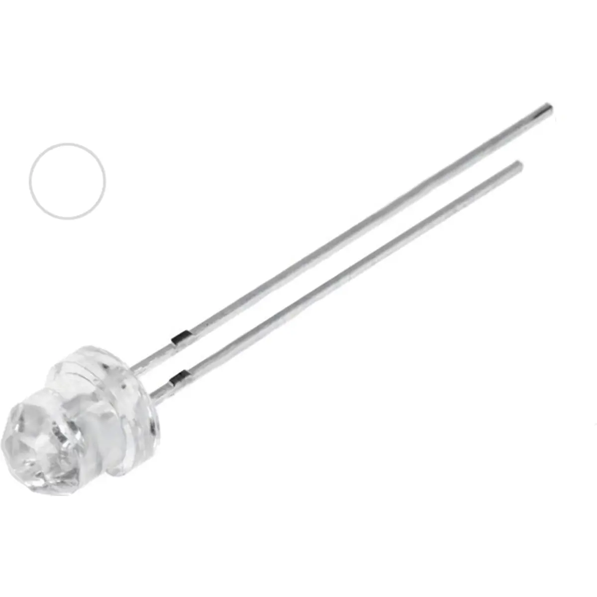 LED de diâmetro 4.85 mm, com emissão de luz branca fria, adequado para sinalização, iluminação discreta e aplicações em PCB. Oferece luminosidade de 1560 a 2180 mcd, montagem em THT e funcionamento entre 2.9 e 3.6 V com corrente de 20 mA. Apresenta coordenadas cromáticas x 0.27 e y 0.28, o que assegura cor estável. Ideal para projetos compactos que requerem montagem através de furação numa placa de circuito impresso, garantindo desempenho estável e integração simples.