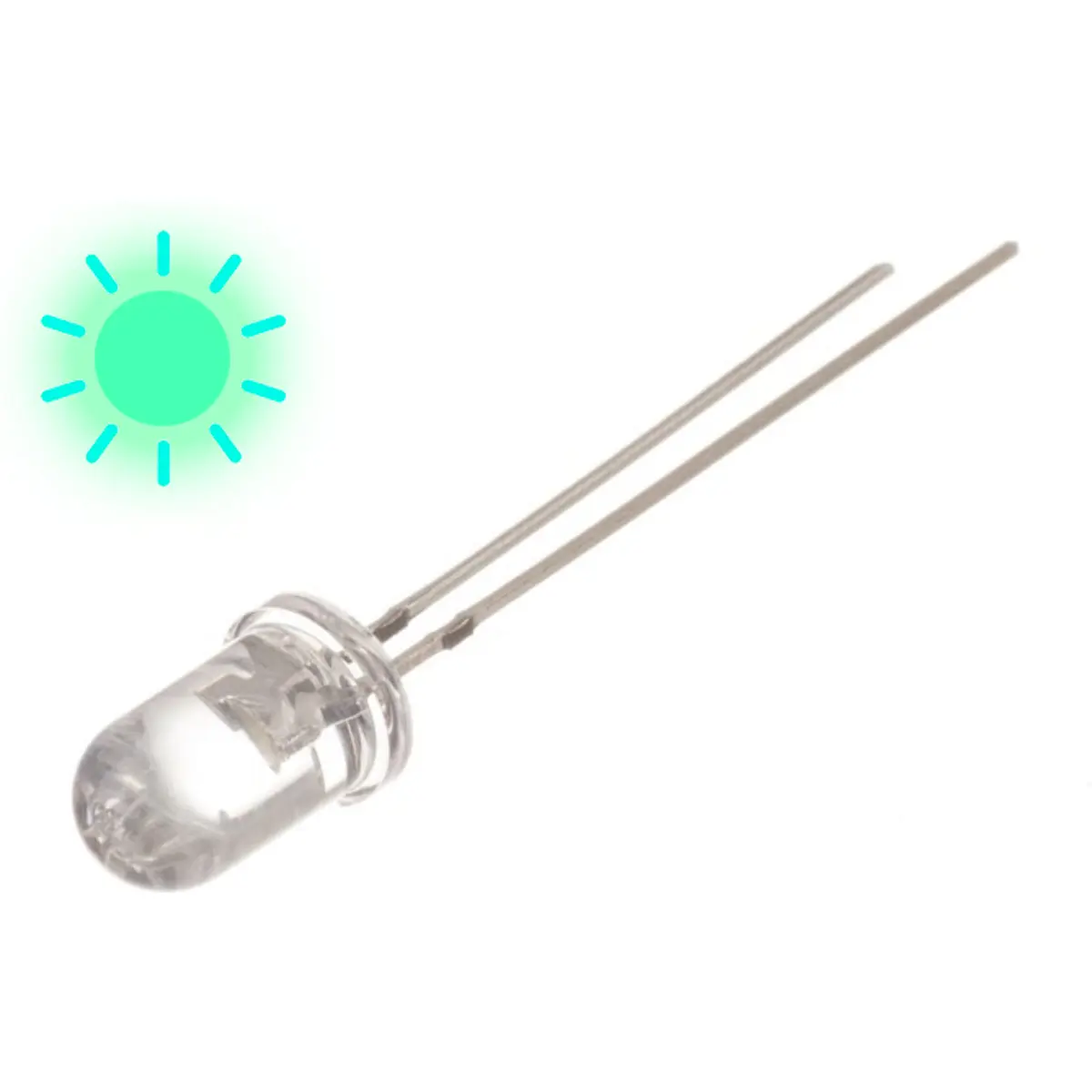 LED de 5 mm verde azulado com lente transparente de alto brilho, capaz de emitir entre 18.000 e 30.000 mcd. Possui ângulo de abertura de 15°, frente convexa e comprimento de onda entre 500 e 510 nm. Opera com corrente de 20 mA e tensão de funcionamento entre 2,8 e 3,6 V. Compatível com montagem em furos (THT) e distância entre pinos de 2,54 mm, tornando-o adequado para indicadores, sinalização e iluminação de PCB em diversas aplicações.
