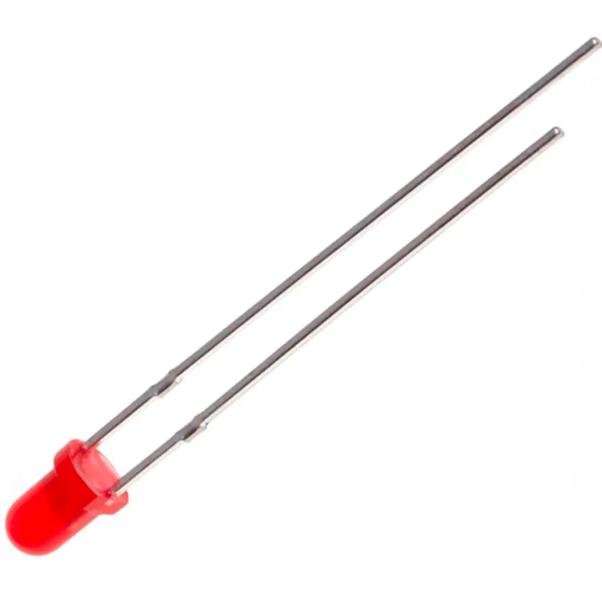 LED vermelho de 3 mm com brilho de 200 mcd, ângulo de visão de 30°, comprimento de onda entre 640 e 650 nm, corrente de 20 mA e tensão operacional entre 1,7 e 2,5 V. Montagem THT com passo de terminais de 2,54 mm. Adequado para sinalização e indicadores em aplicações eletrónicas de baixo consumo.