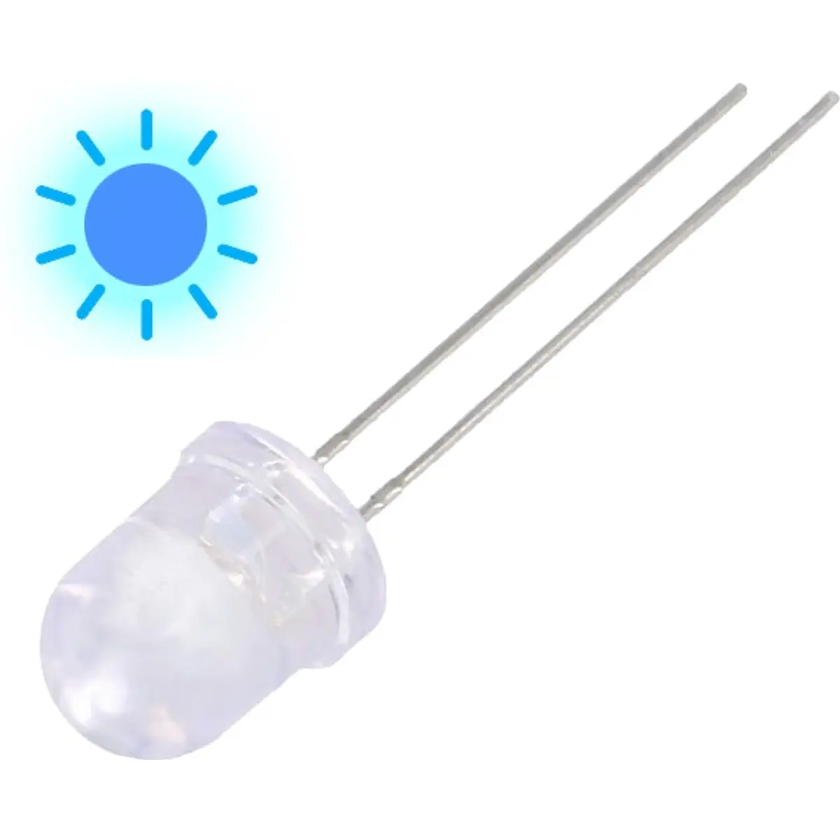 LED azul de 8 mm com lente transparente e alto brilho, oferecendo luminosidade entre 2900 e 5000 mcd e comprimento de onda de 470 nm. Opera a 2,6 a 3,4 V com corrente de 20 mA, montagem THT e frente convexo, oferecendo visualização estável e fácil integração em circuitos eletrónicos com ângulo de visão de 25 graus.