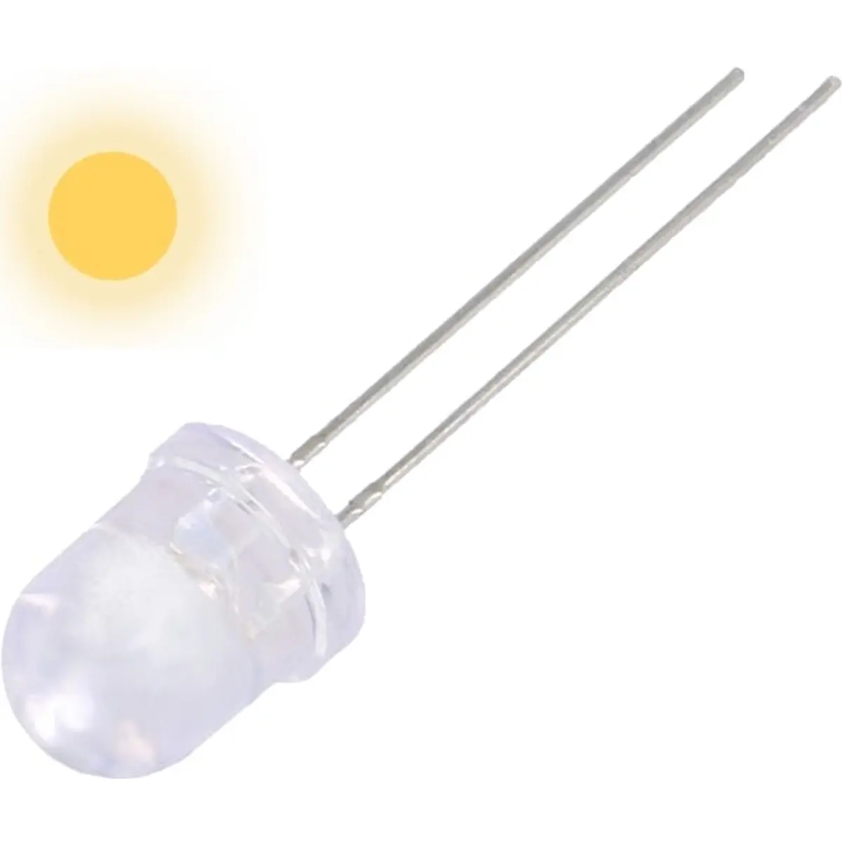LED âmbar de 8 mm para montagem em PCB com lente transparente, desempenho de 1000-1700 mcd a 605 nm. Opera a 20 mA, com montagem THT, frente convexo, tensão operacional de 1,6-2,6 V e ângulo de visão de 30 graus. Adequado como indicador luminoso em painéis e circuitos, oferecendo boa visibilidade em diferentes ângulos de observação.