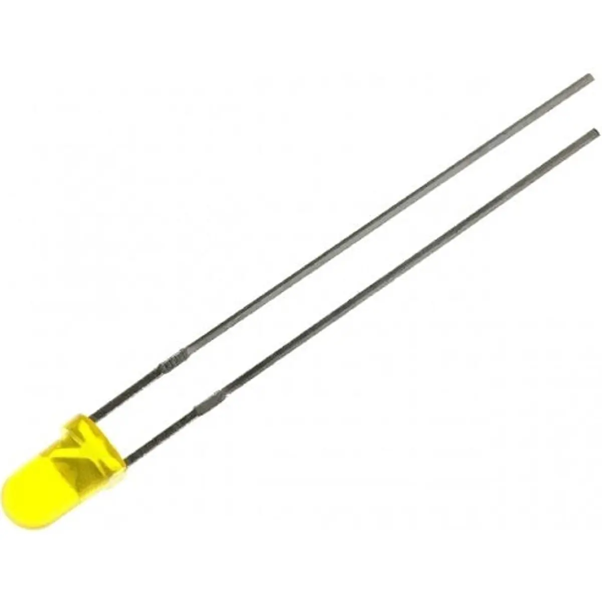 LED de 3 mm com cor amarela e brilho de 65 mcd, para montagem em placas com lente difusa e frente convexo. Opera entre 2,0 e 2,5 V com corrente de 10 mA, e tem passo de terminais de 2,54 mm e ângulo de visão de 60°. Adequado para sinalização, indicadores e iluminação discreta em PCB, com montagem em through-hole (THT).