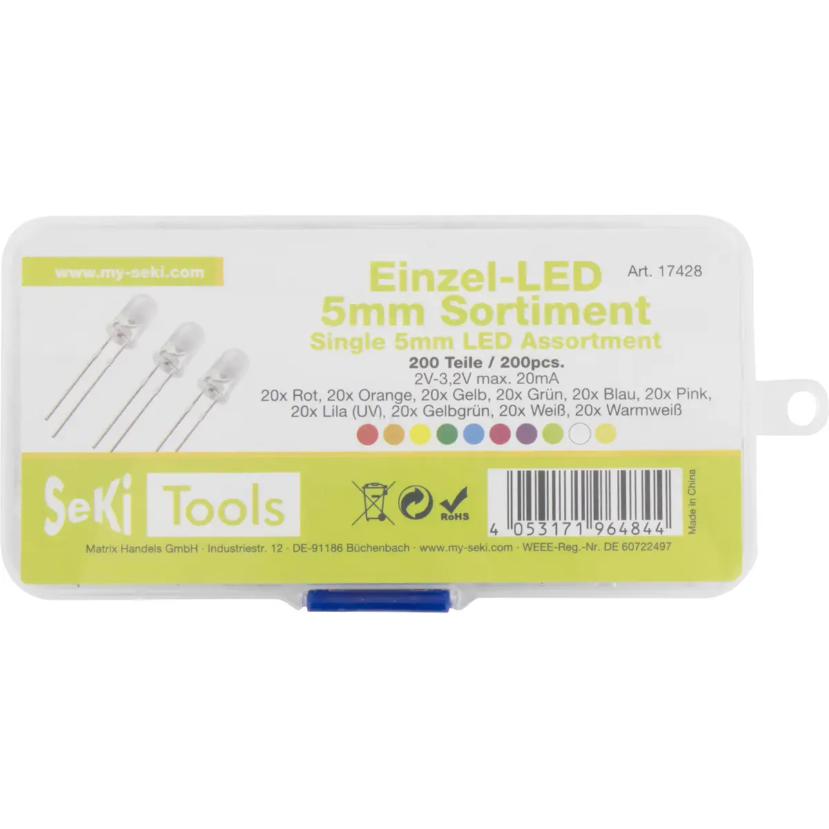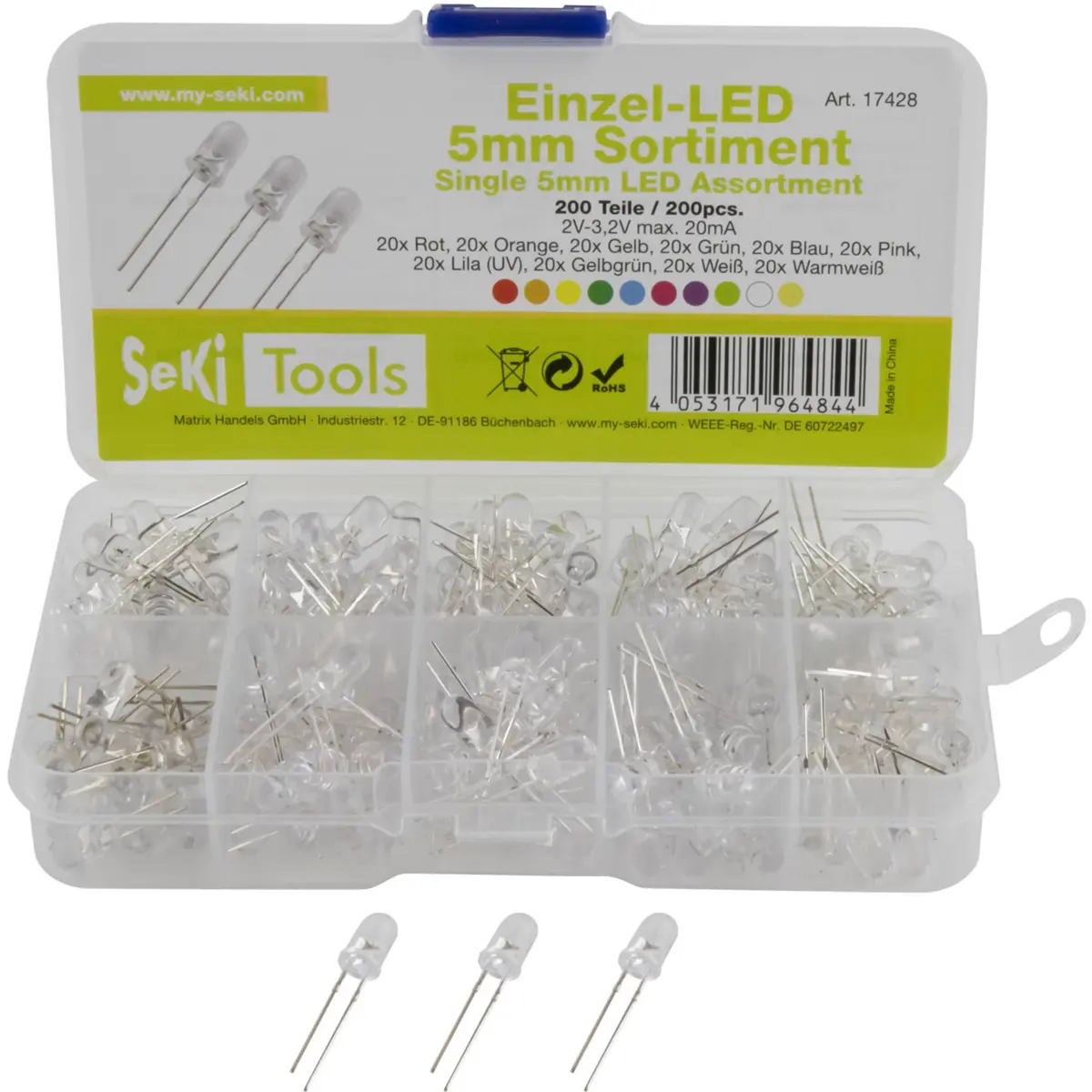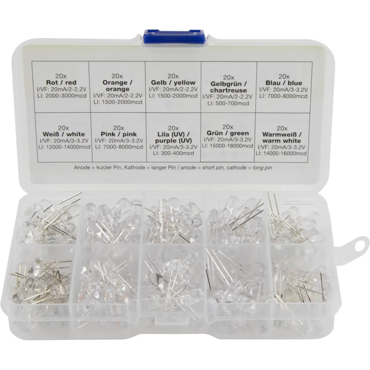 Sortido de 200 LEDs 5mm transparente (várias cores)