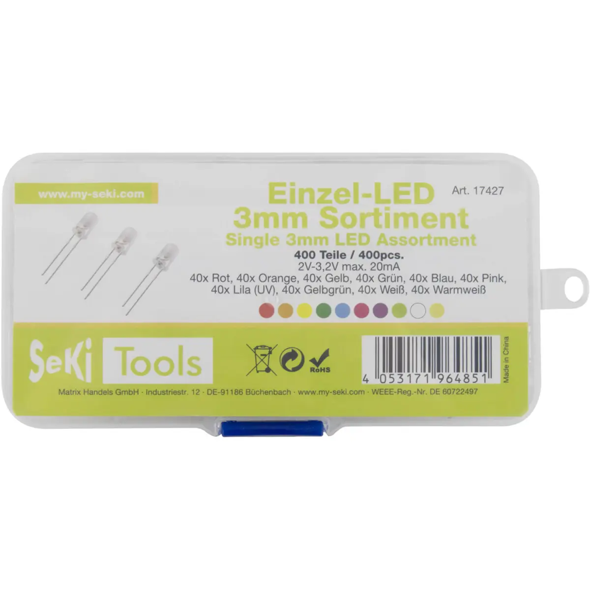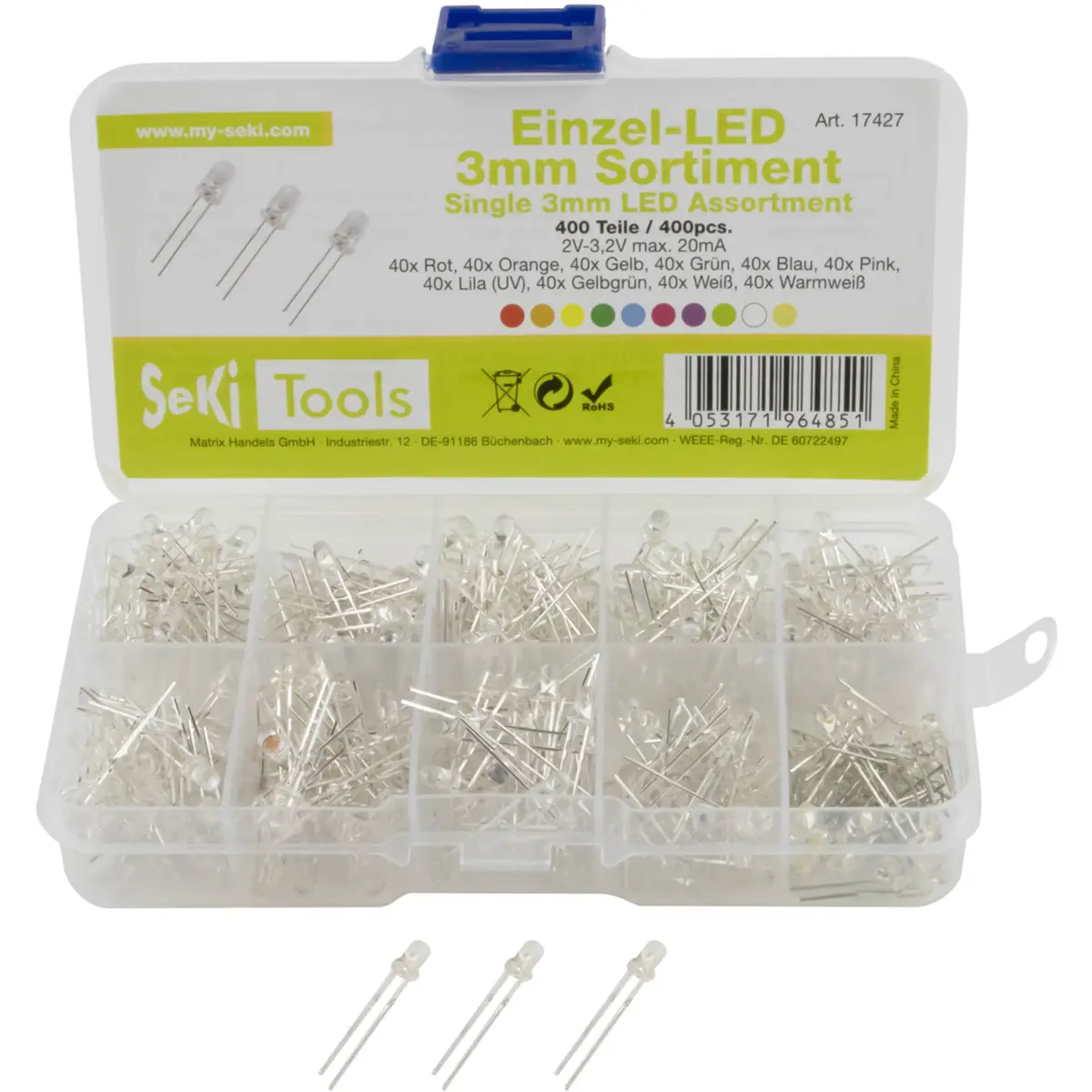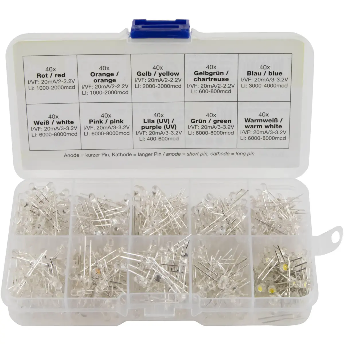 Sortido de 400 LEDs de 3 mm com encapsulamento transparente, disponível em várias cores: 40 vermelhos, 40 laranjas, 40 amarelos, 40 verdes, 40 azuis, 40 rosas, 40 roxos (UV), 40 Chartreuse (amarelo esverdeado), 40 brancos e 40 brancos quentes. Ideal para iluminação decorativa, projetos de hobby e trabalhos manuais, permitindo combinações multicoloridas para criar efeitos visuais variados em painéis, molduras e luminárias.