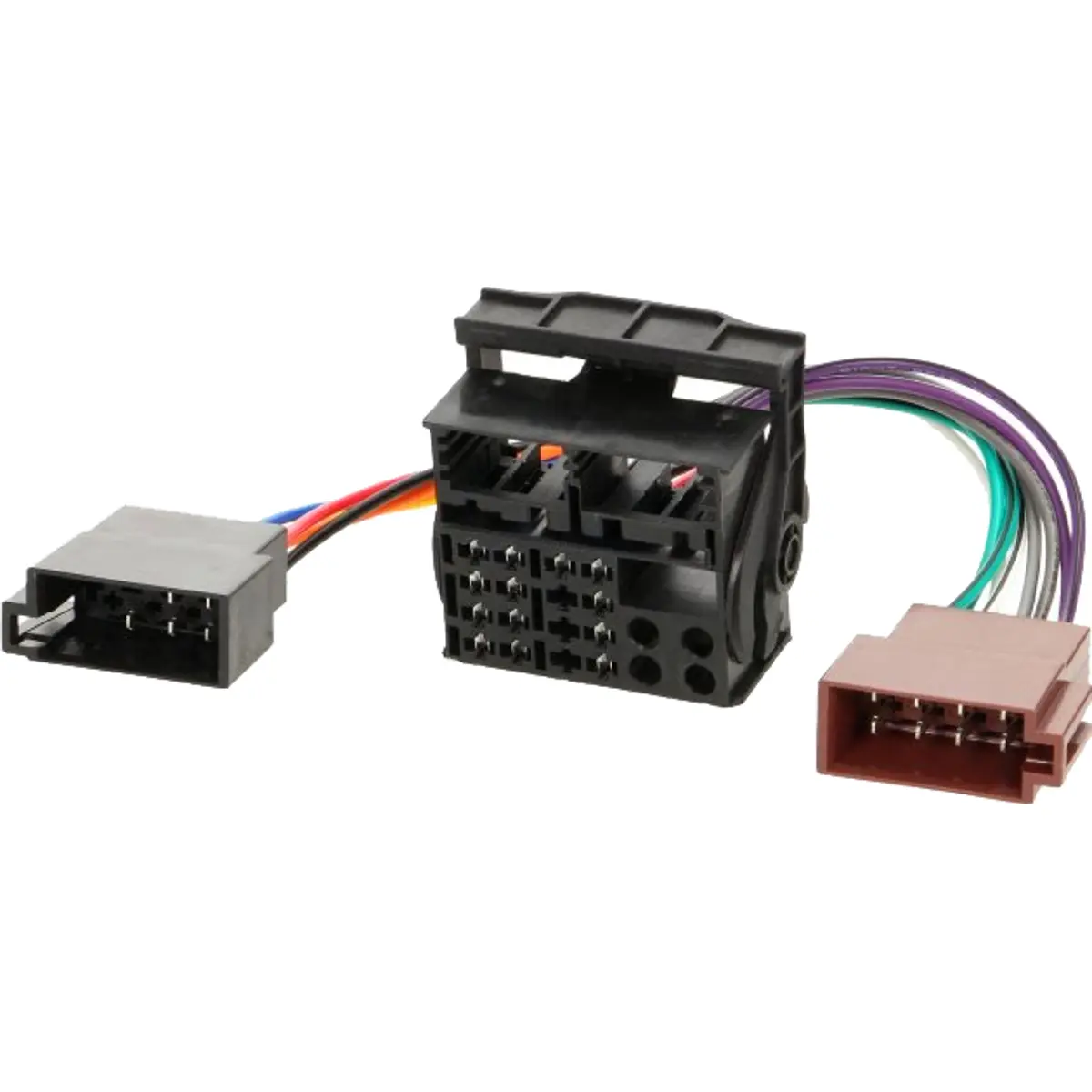 Adaptador de autorádio com conector ISO macho, compatível com BMW e Land Rover (inclui Defender 2 e Range Rover) para ligações entre rádio ISO e fiação do veículo. Ideal para instalações de rádios aftermarket mantendo a compatibilidade com as entradas originais.