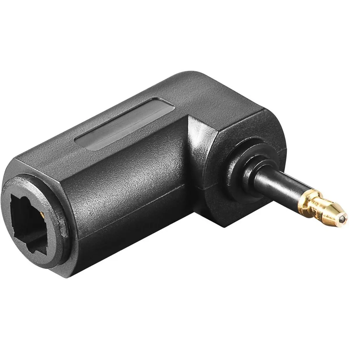 Adaptador óptico Toslink fêmea para jack digital 3,5 mm macho com ângulo de 90°, que facilita a conexão entre dispositivos com saída Toslink e entradas compatíveis com jack de 3,5 mm, sem conversão de sinal. Não transforma digital em analógico nem vice-versa; mantém o caminho óptico apenas com o conector. Ideal para ligações rápidas entre equipamentos sem necessidade de conversão.