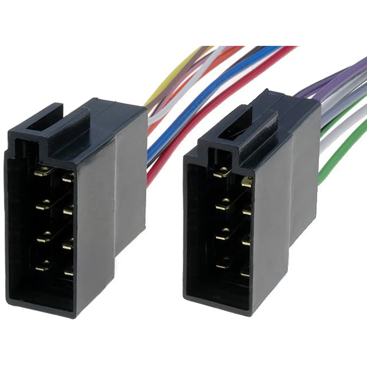 Ficha ISO macho para autorádio com fios, compatível com radioreceptores automóvel. Possui tomada ISO x2 e 16 pinos (8+8) para ligações de alimentação e áudio, facilitando a substituição de conectores danificados e assegurando ligações estáveis entre a unidade principal e o sistema elétrico do veículo.