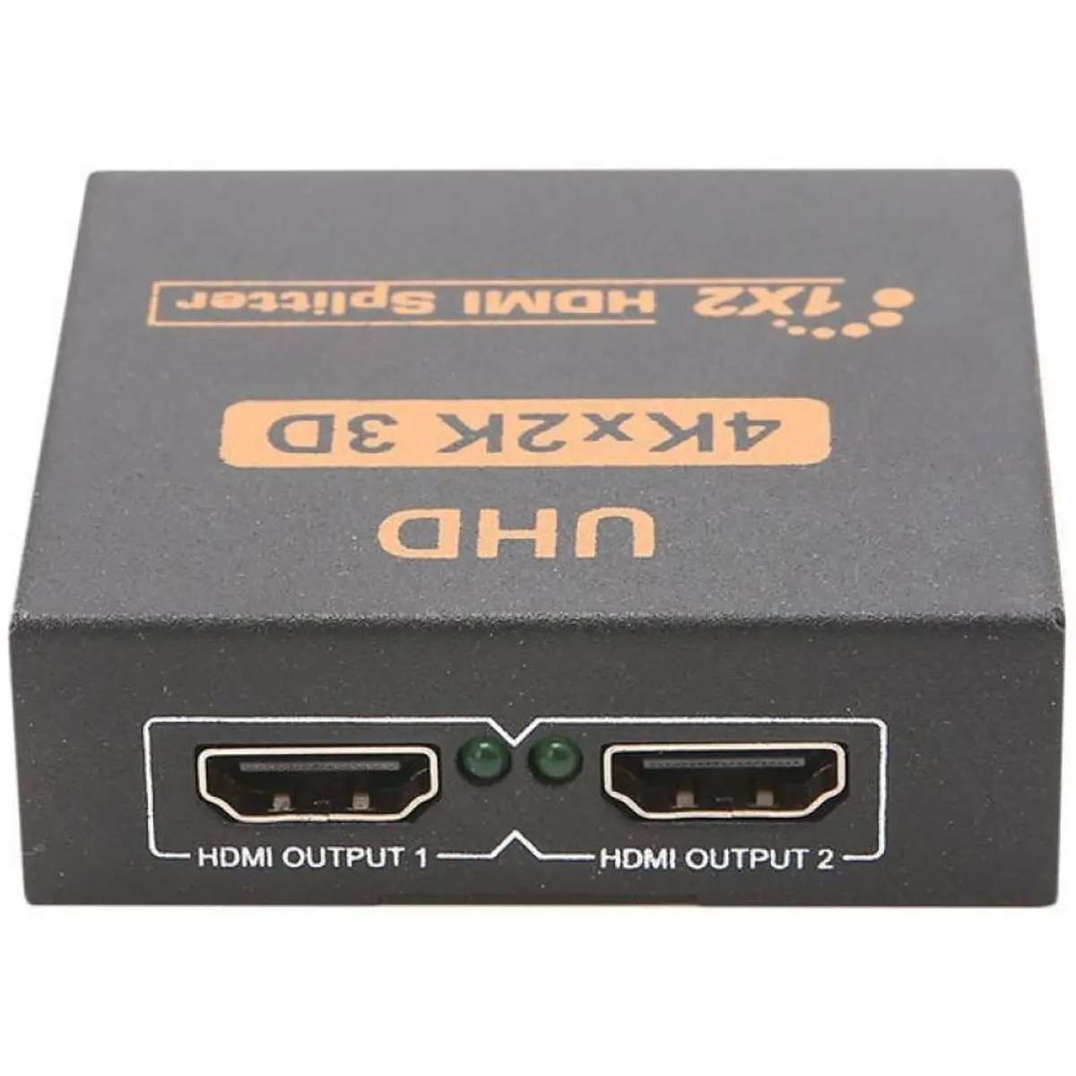 Distribuidor HDMI de 1 entrada para 2 saídas com resolução até 3840x2160/30Hz e HDMI 1.4b. Suporta cores profundas 8/10/12bit e áudio DTS-HD, Dolby-trueHD, DTS, Dolby-AC3 e DSD. Largura de banda até 340MHz e baud rate 3.4Gbps. Compacto (65x60x20mm) e leve (120g), funciona entre -15ºC e 55ºC, com humidade de 5% a 90% (sem condensação). Ideal para ligações a múltiplos monitores ou TV, mantendo sinal estável com cabos curtos (<8 m).