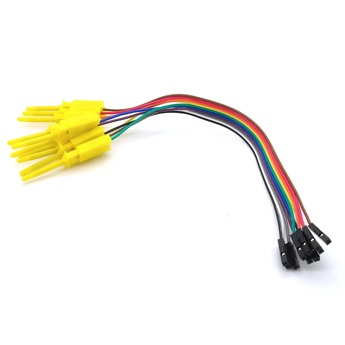 Conjunto de cabos de ligação tipo jumper fêmea com pinças de prova em gancho, ideal para prototipagem de circuitos. Inclui 10 fios independentes, com pinça de gancho de mola e fios separáveis para ligações simples e personalizadas. Permite ligar componentes como ICs e relés, bem como conectar a um Raspberry Pi ou a um cabeçalho de pinos, facilitando experiências educativas e projetos de electrónica de baixo custo, com organização e flexibilidade.