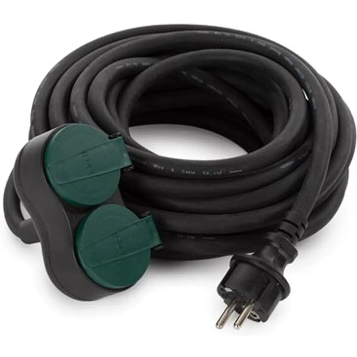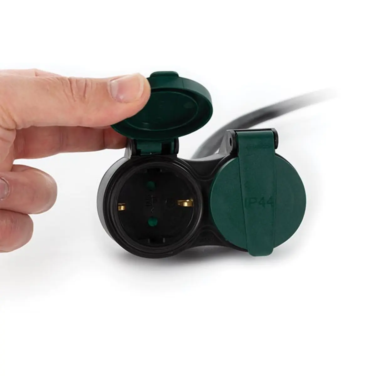 Extensão Schuko com proteção IP44, cabo de 10 metros, com plugue macho e duas tomadas. Inclui proteção para crianças, cabo H07RN3G2.5mm2, 230 V e até 16 A (3680 W). O conjunto em plástico e cobre oferece durabilidade e isolamento, adequado para ligações seguras de dispositivos numa extensão eléctrica com proteção adicional.