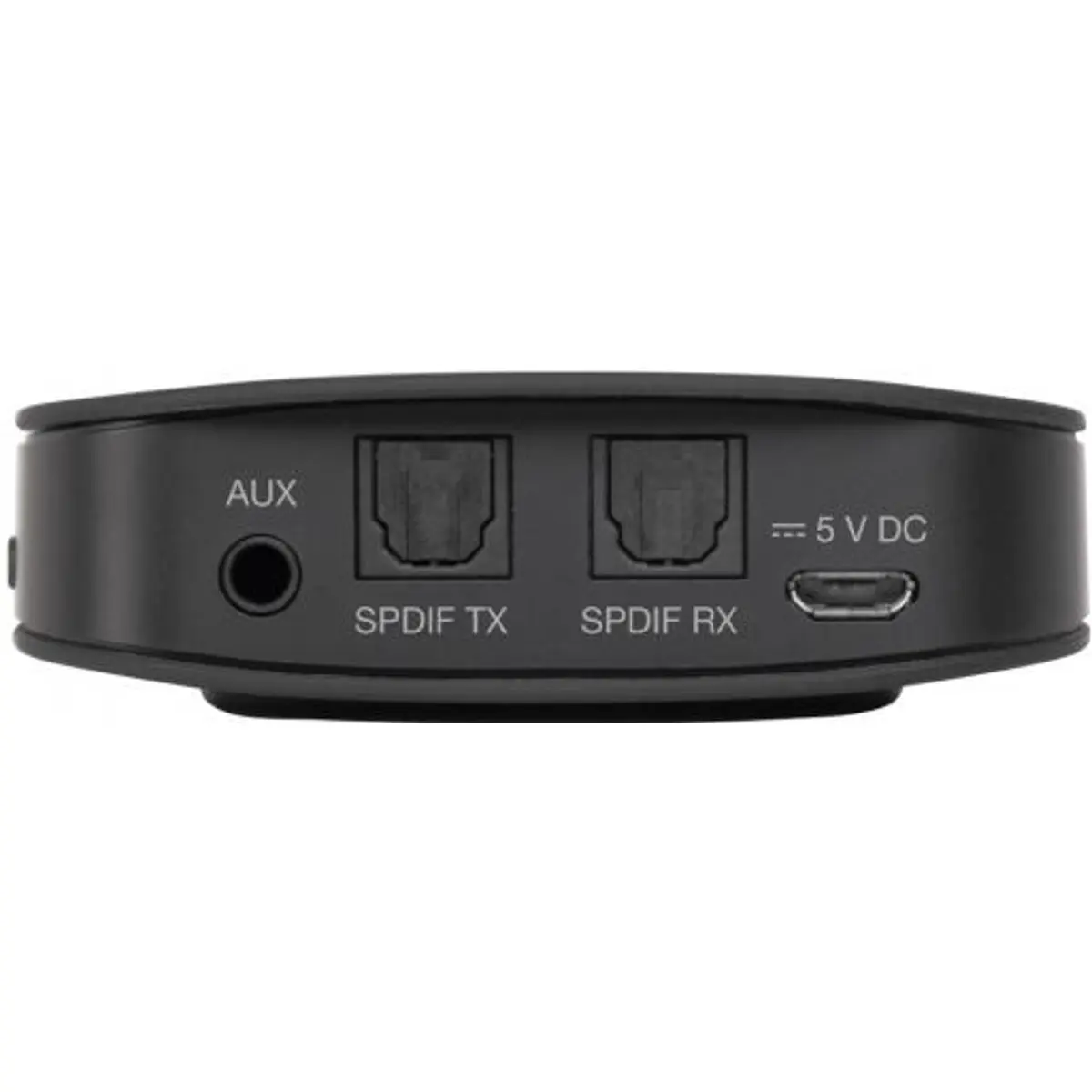 Transmissor/receptor de áudio Bluetooth 5.0 com chip CSR8670, permite ligar TV ou equipamento de som via SPDIF Toslink e entrada/saída auxiliar. Suporta dois dispositivos simultâneos em modo transmissor ou recetor, com codecs aptX (baixa latência), aptX HD, AAC e SBC. Oferece controlo de reprodução no modo recetor, alcance até 10 metros e autonomia de até 14 horas com bateria Li-ion de 350 mAh, com tempo de carregamento de cerca de 2 horas. Design compacto e leve, inclui cabos para recarga e áudio.