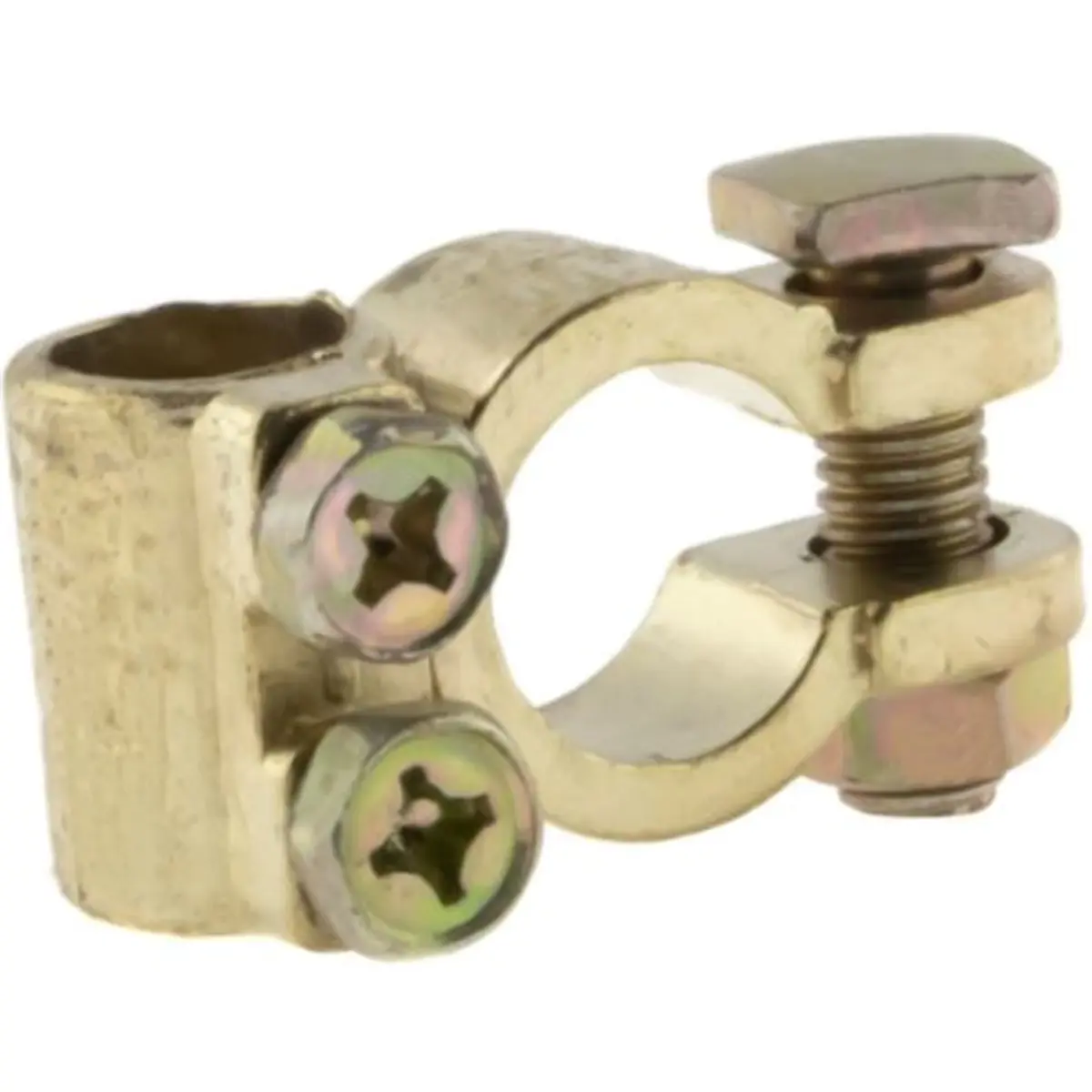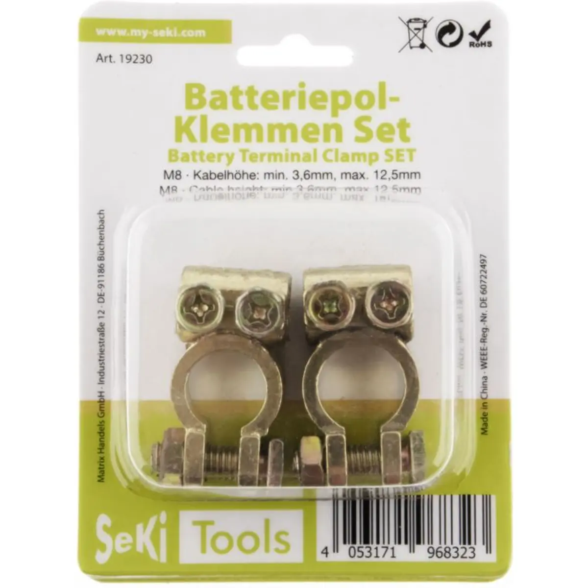 Conjunto de bornes de bateria dourados com terminais negativo e positivo, compatíveis com cabos de 3,6 a 12,5 mm. Utiliza parafusos M8 para fixação e é vendido em blister. Ideal para ligações elétricas seguras entre bateria e cablagem, oferecendo uma solução compacta e prática para instalações que exijam bornes com terminais M8.