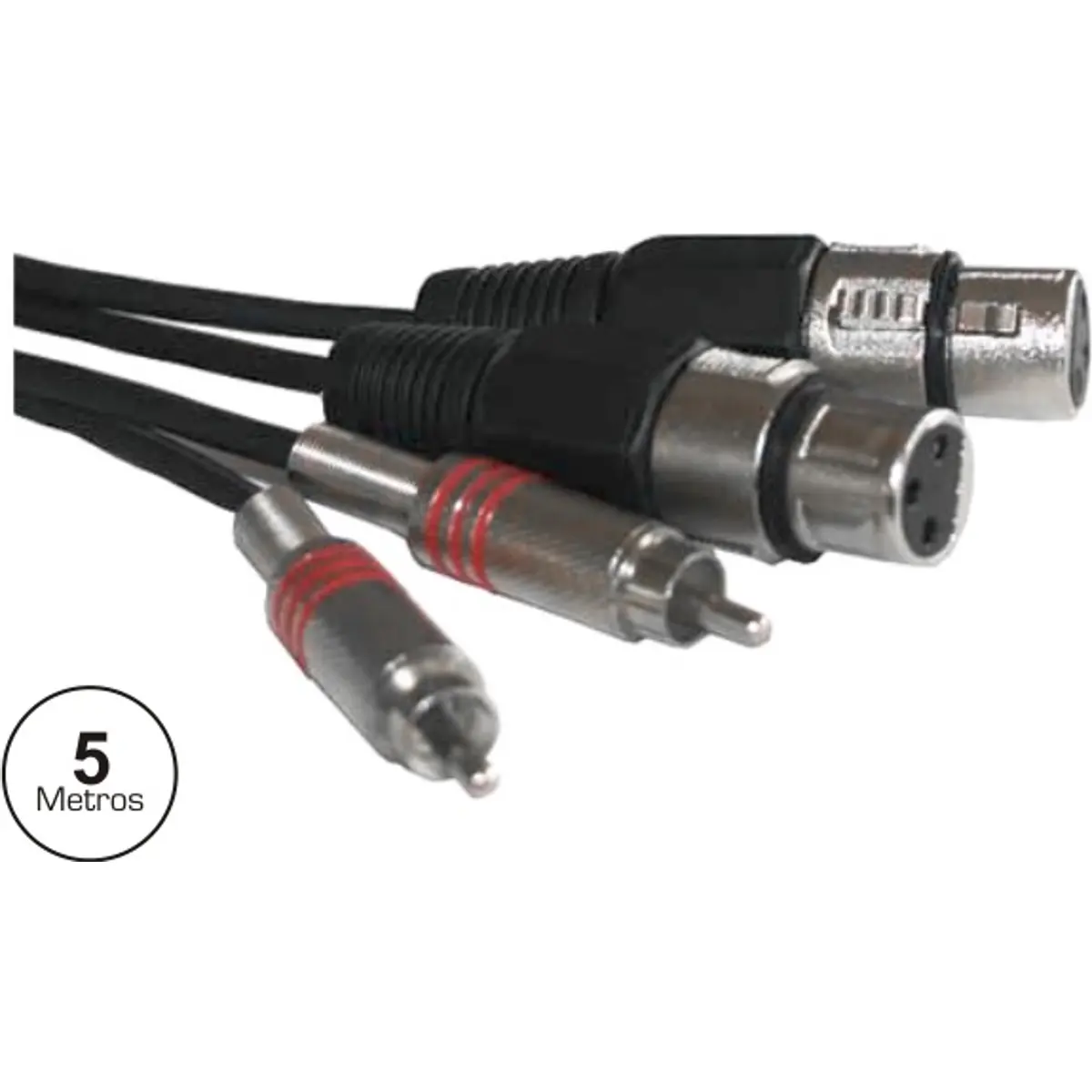 Cabo de áudio com 2 RCA macho ligados a duas fichas XLR de 3 pinos Fêmeas.