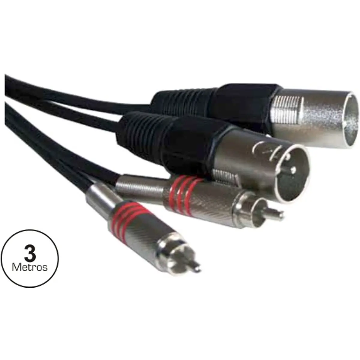 Cabo de áudio com 2 RCA macho ligados a duas fichas XLR de 3 pinos Macho.