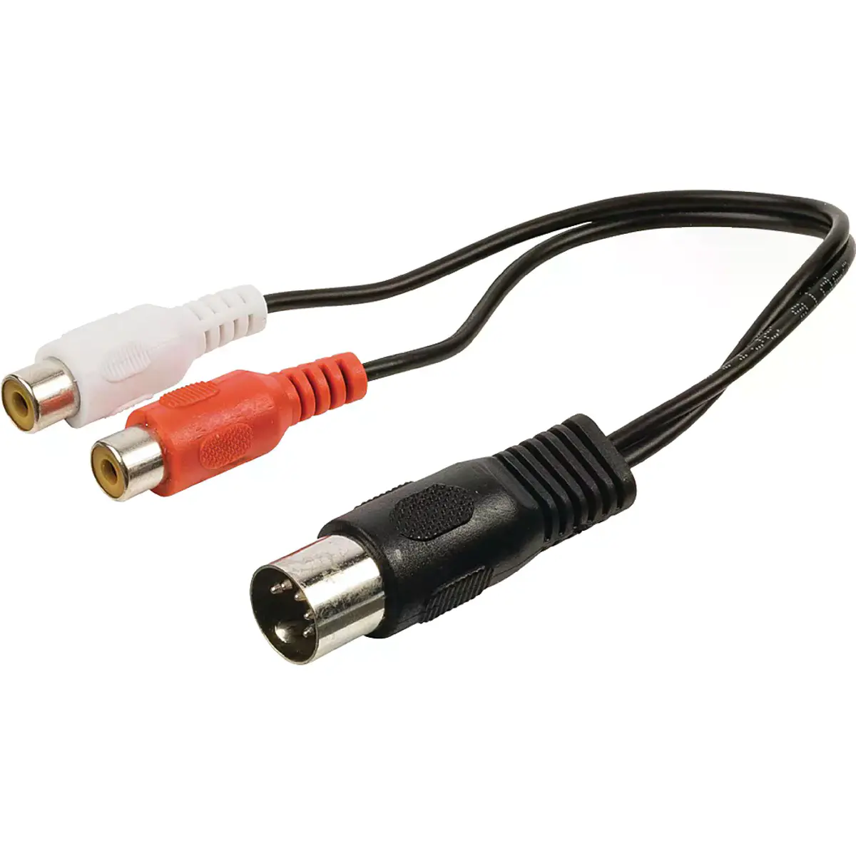 Cabo de áudio que liga um conector DIN de 5 pinos a duas ligações RCA fêmea, suportando áudio estéreo. Possui condutor CCS, isolamento em PVC e corpo preto, com comprimento de 0,2 m. Ideal para ligações entre equipamentos de áudio estéreo, oferecendo transmissão estável e compatibilidade com sistemas de áudio doméstico.