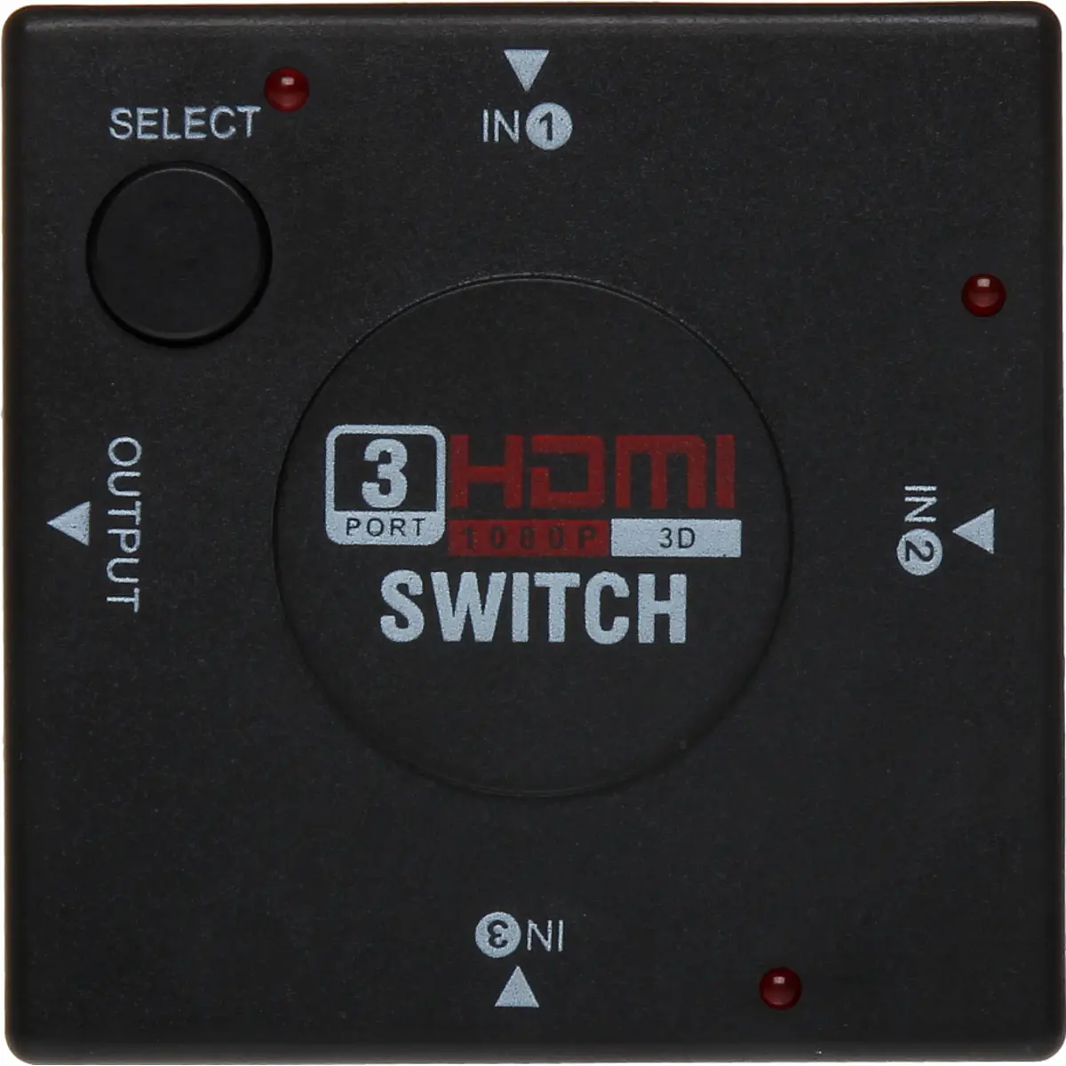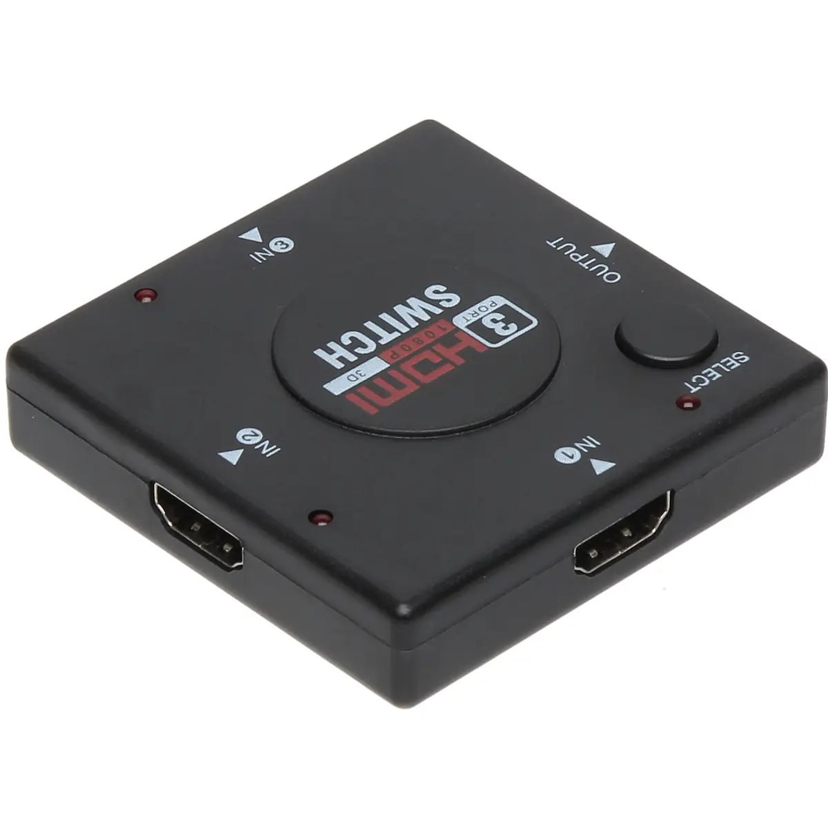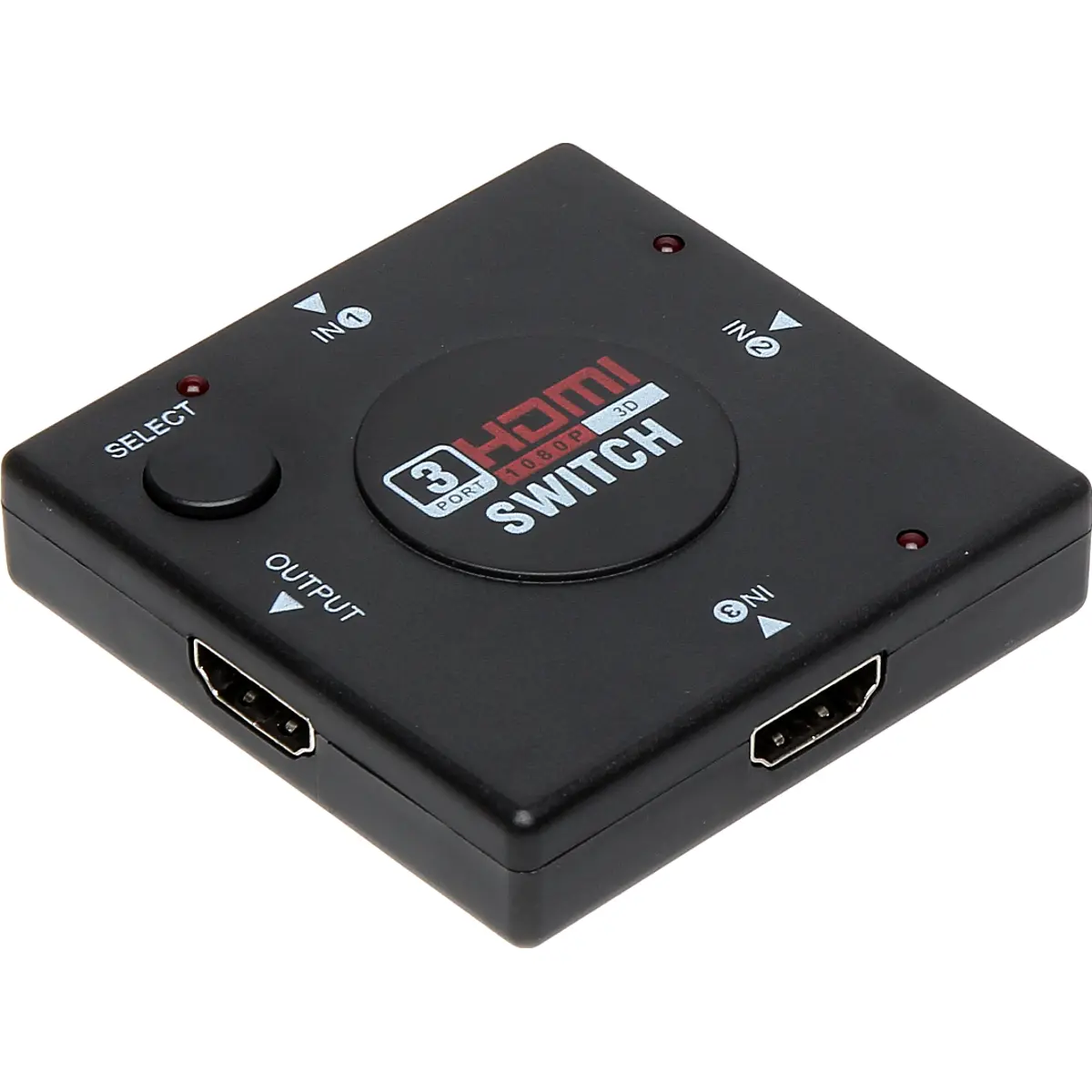 Este dispositivo HDMI com três entradas e uma saída permite selecionar entre fontes HDMI para um único ecrã. Suporta resolução até 1080p e formatos de áudio LPCM, Dolby-AC3, DTS7.1, Dolby True HD e DTS-HD. Consumo inferior a 1 W e alimentação através do cabo HDMI. Dimensões compactas (66 x 66 x 16 mm) e peso de 0,04 kg; HDCP não especificado. Ideal para ligações simples entre várias fontes HDMI, oferecendo comutação rápida e sem perdas de qualidade.