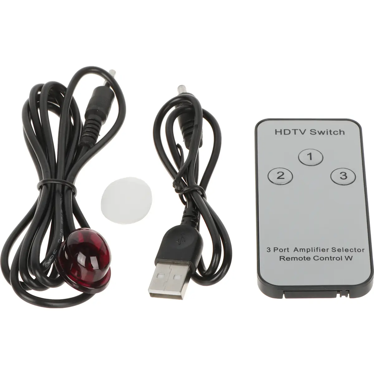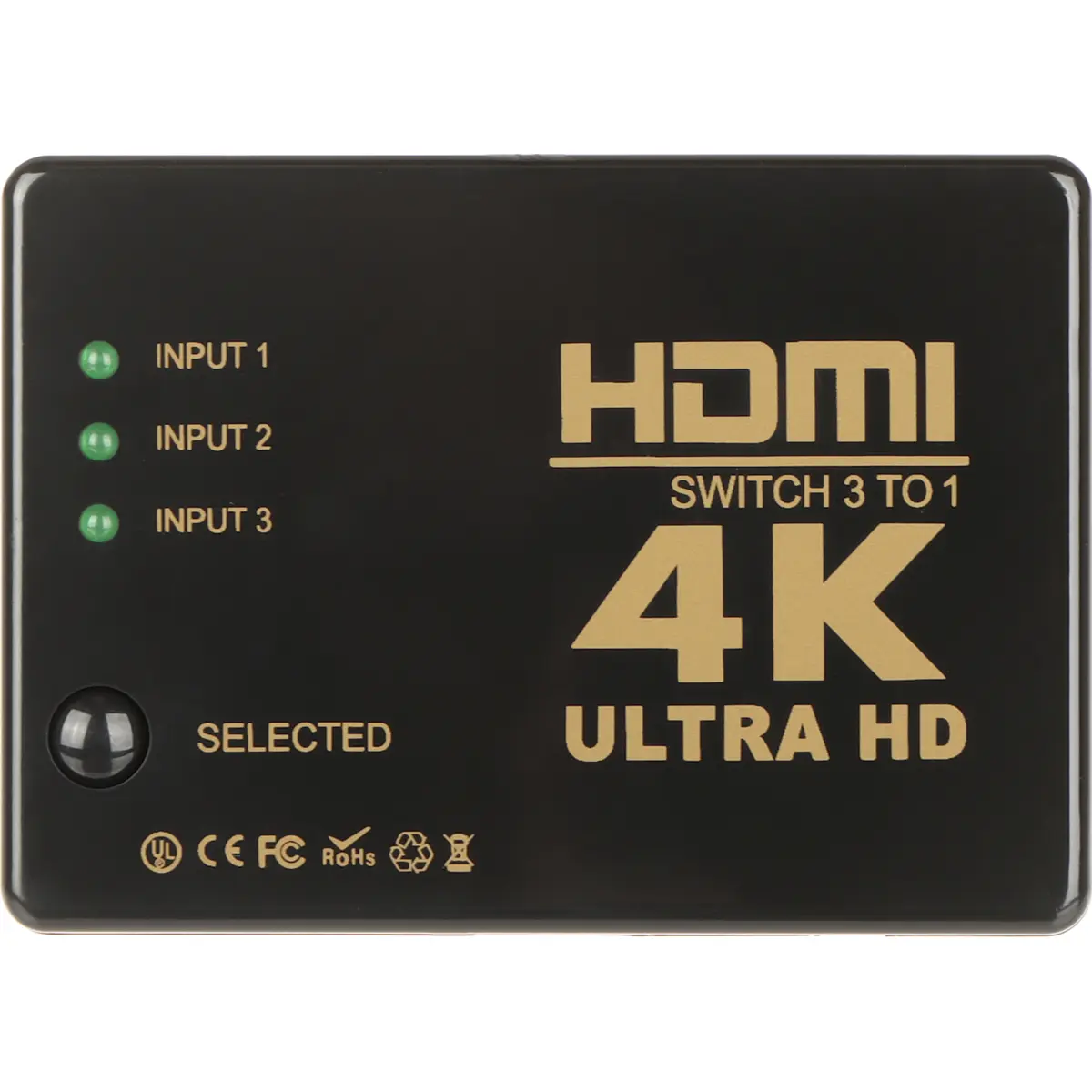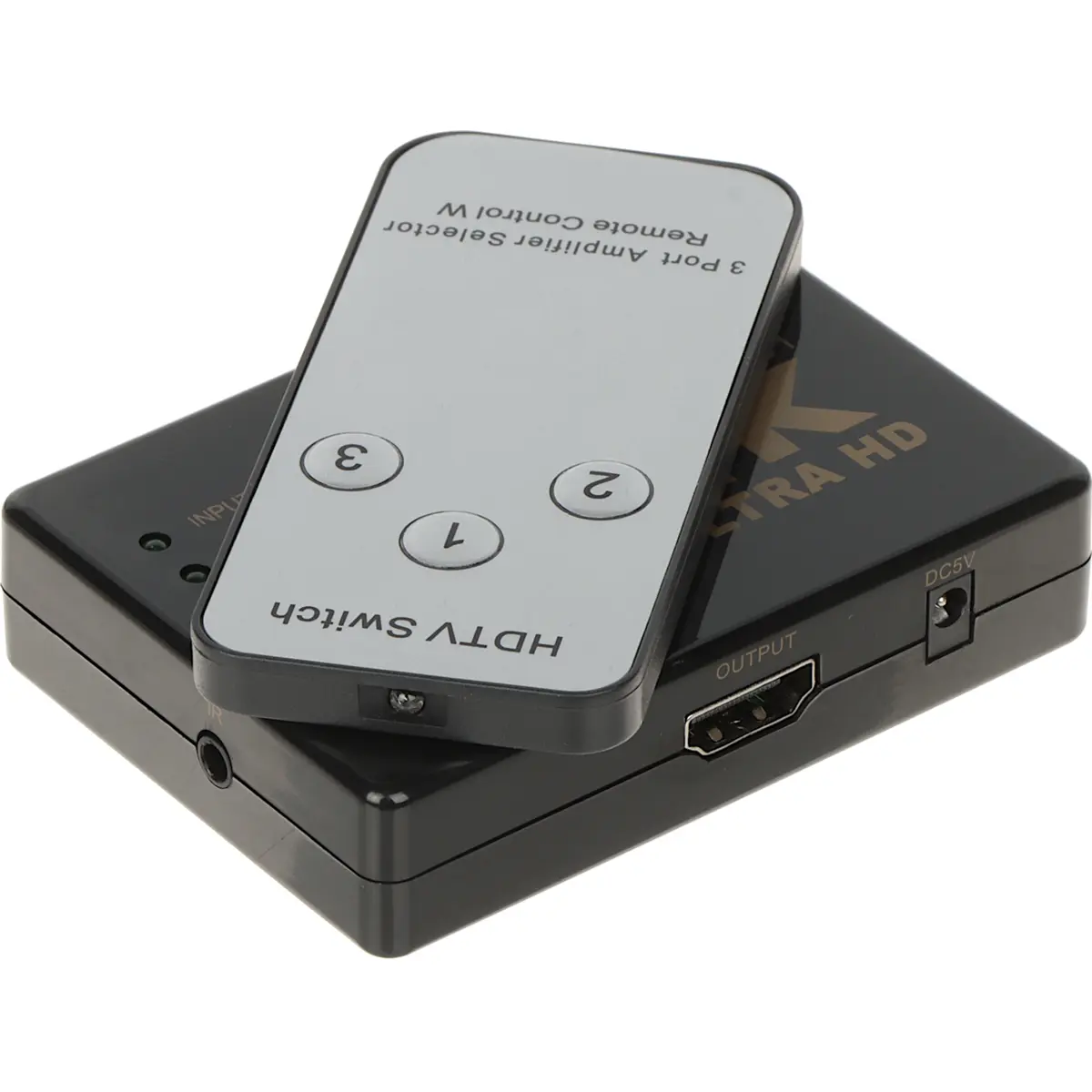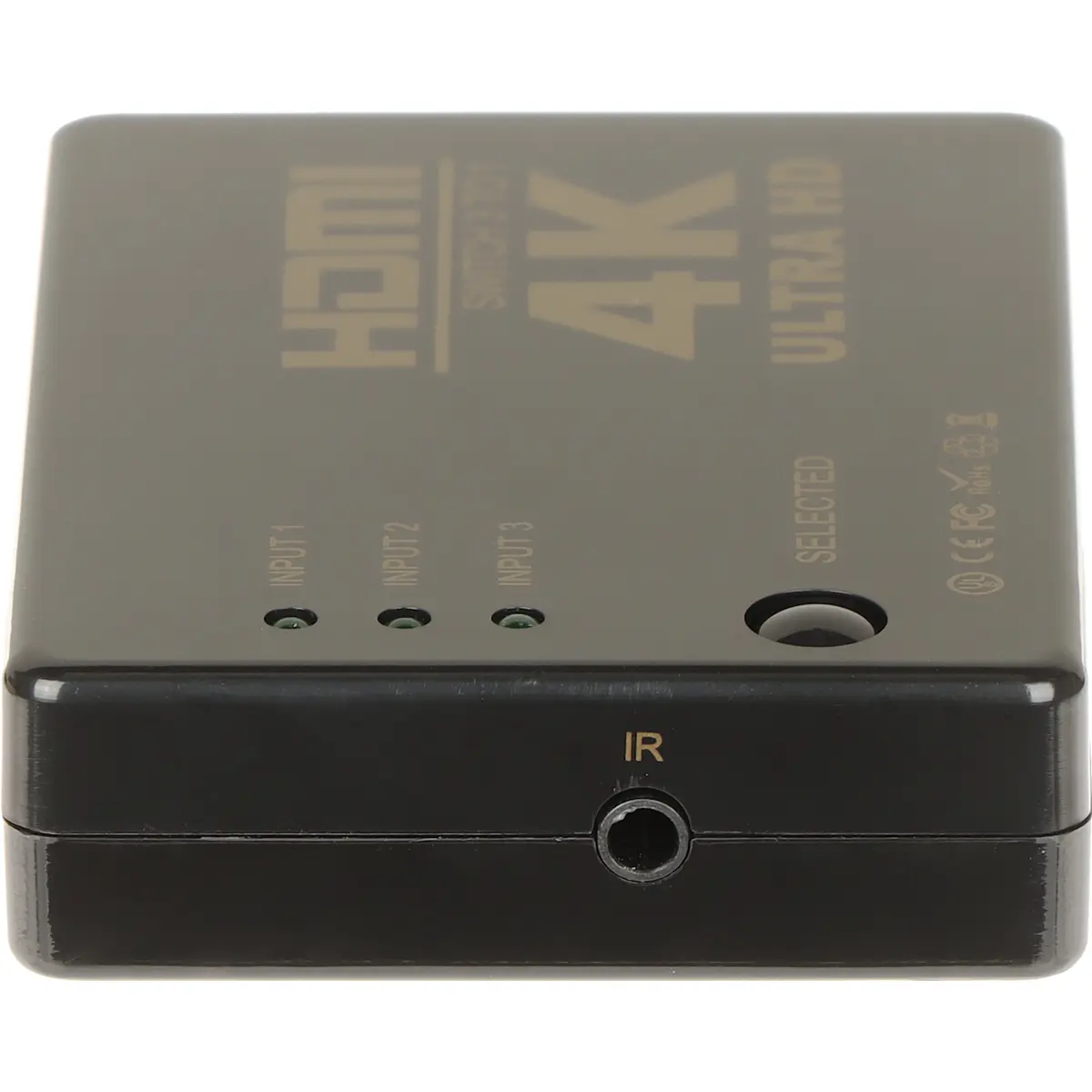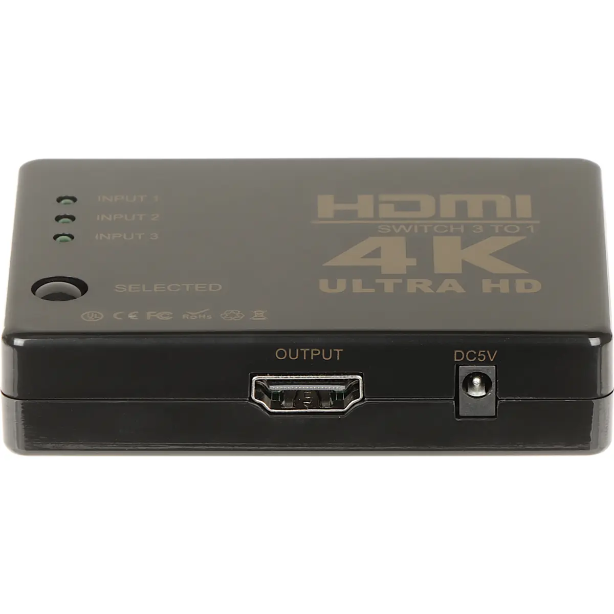 Comutador HDMI 3x1 com comando para gestão de várias fontes de sinal. Suporta 4K UHD, 1440p QHD, 1080p e 3D 1080p, com HDCP não especificado. Aceita áudio LPCM, Dolby Digital, Dolby Digital (AC-3) e DTS Digital. Compatível com Deep Color 12-bit e taxa de transferência até 3,4 Gbps. Modo automático inteligente e manual com controlo remoto incluído; receptor IR com alcance de 115 cm. Alimentação 5 V DC, dimensões 82 x 59 x 19 mm, peso 0,044 kg.