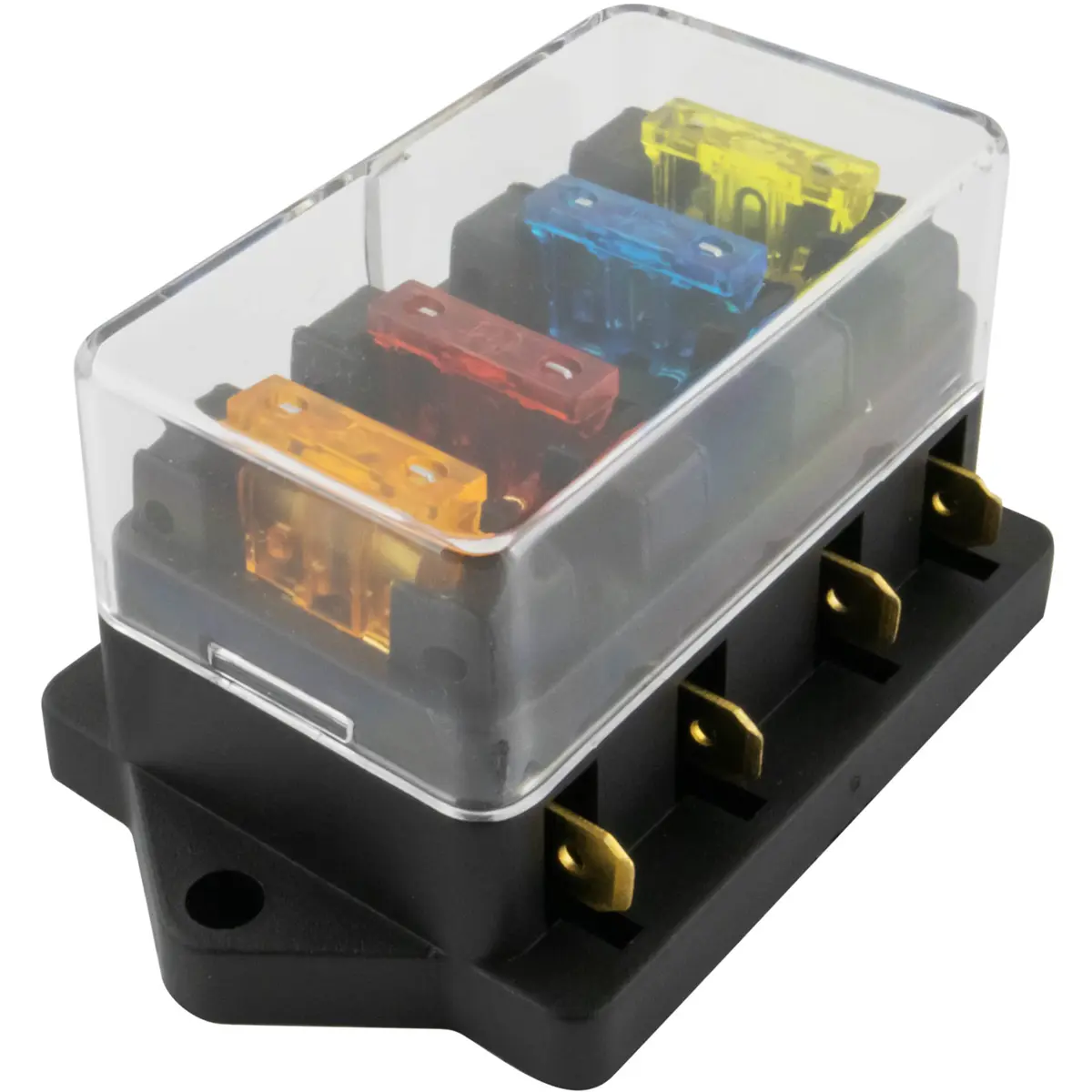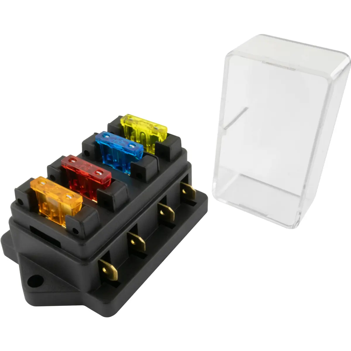 Conjunto porta-fusíveis com configuração de 4 vias e tensão nominal até 32V DC por circuito, dimensões compactas de 86 x 53 x 42 mm. Inclui fusíveis de 10A, 15A, 20A e 30A para substituição rápida. Conexões de saída até 30A por circuito. Tampa transparente que oferece proteção contra contacto. Ideal para instalações automotivas e sistemas elétricos que exigem organização, segurança e fácil acesso aos fusíveis.
