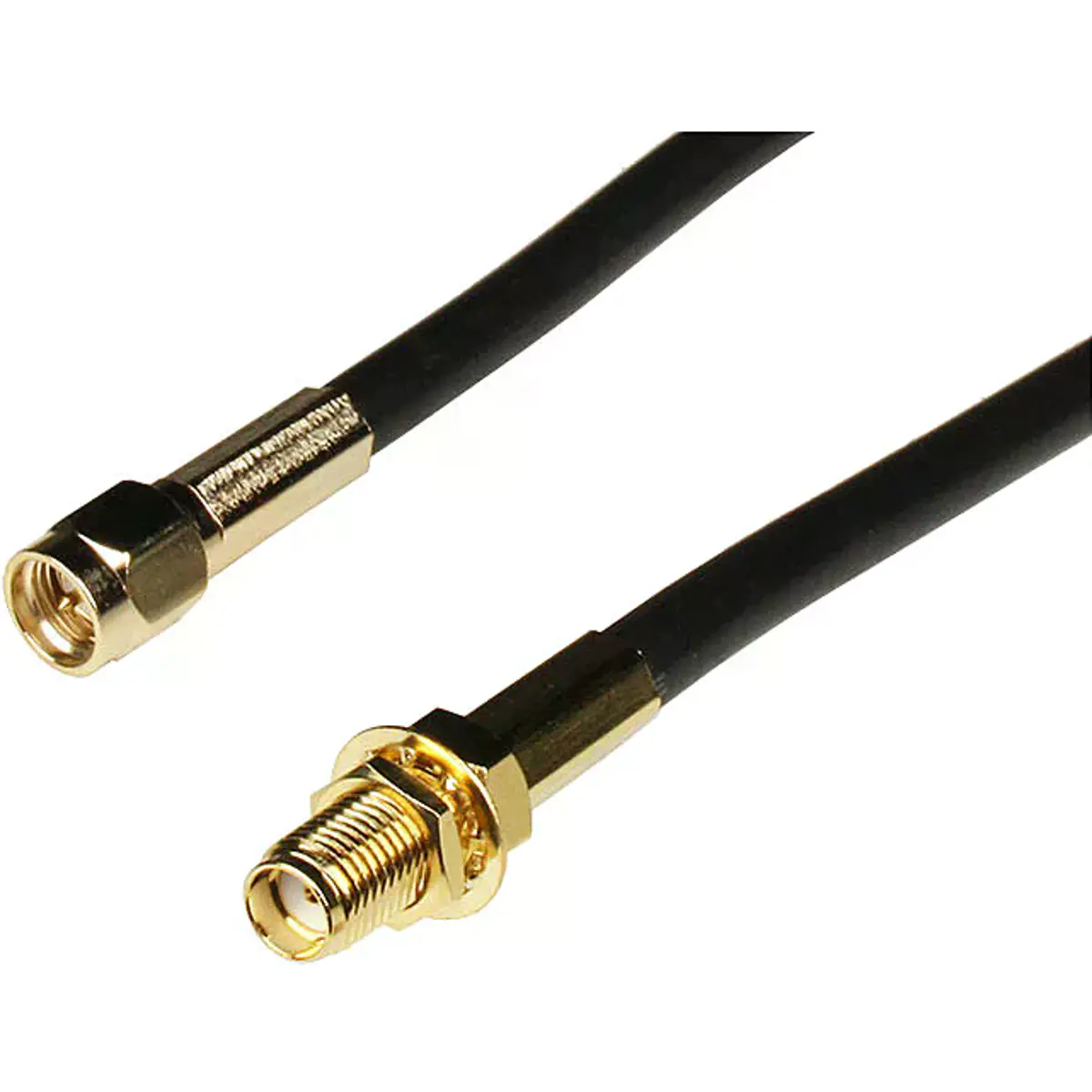 RG58 LowLoss cabo coaxial com conectores SMA macho e SMA fêmea, impedância de 50 ohm, diâmetro de 5,0 mm e comprimento de 10 m. Possui revestimento externo em PVC, banhado a ouro e proteção dupla, oferecendo fiabilidade em ligações RF. Ideal para aplicações de transmissão de sinal entre dispositivos com conectores SMA, onde se exige baixa perda e desempenho estável em ambientes de telecomunicações.