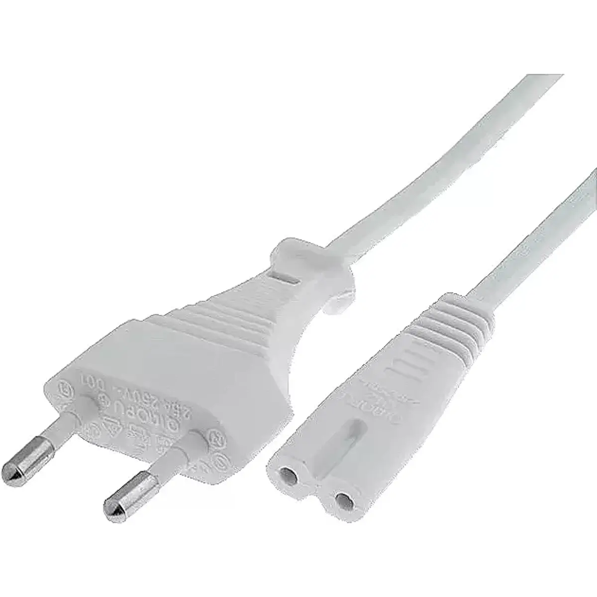 Este cabo de alimentação liga um plugue euro CEE 7/16 a uma ficha IEC 60320 C7 (fêmea). Possui condutor H03VV-H2F 2x0,75 mm², suportando 230 V, 2,5 A e 625 W. Está testado e aprovado pelo VDE, oferecendo segurança e conformidade para ligações de energia entre dispositivos e tomadas compatíveis.