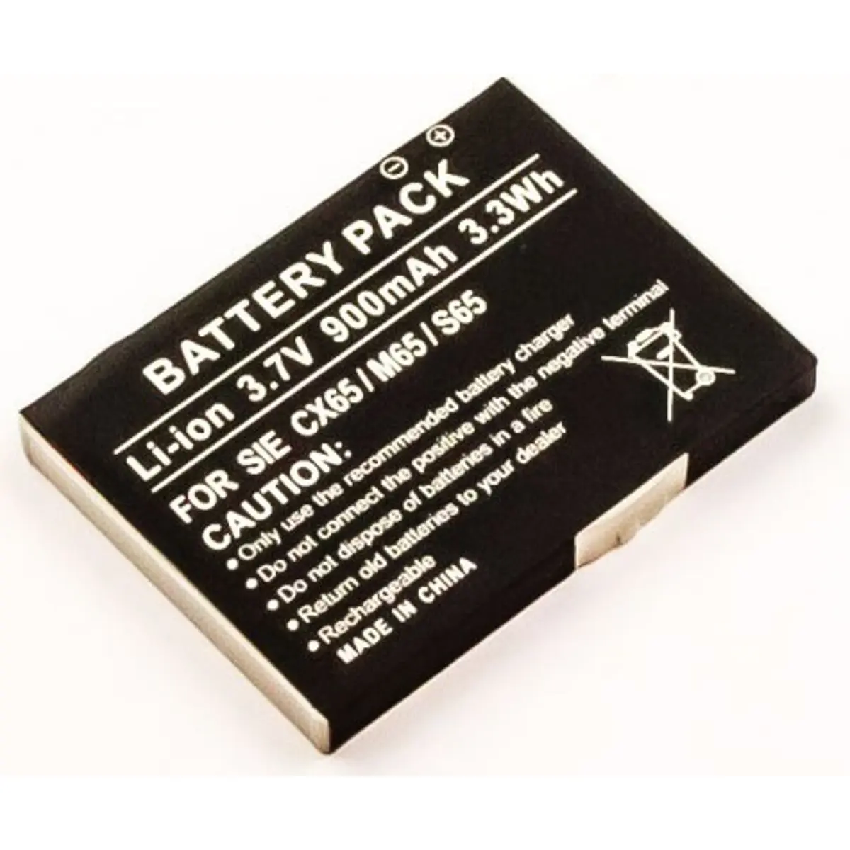 Bateria para telemóvel compatível com CX65, M65 e S65, com 3,7 V, 900 mAh e 3,3 Wh, em Li-Ion. Dimensões compactas de 51,9 x 39,5 x 6 mm e peso de 18 g são indicadas para substituição de baterias originais em telemóveis compatíveis, oferecendo fiabilidade, desempenho estável e eficiência de recarga sem alterar o funcionamento do aparelho.