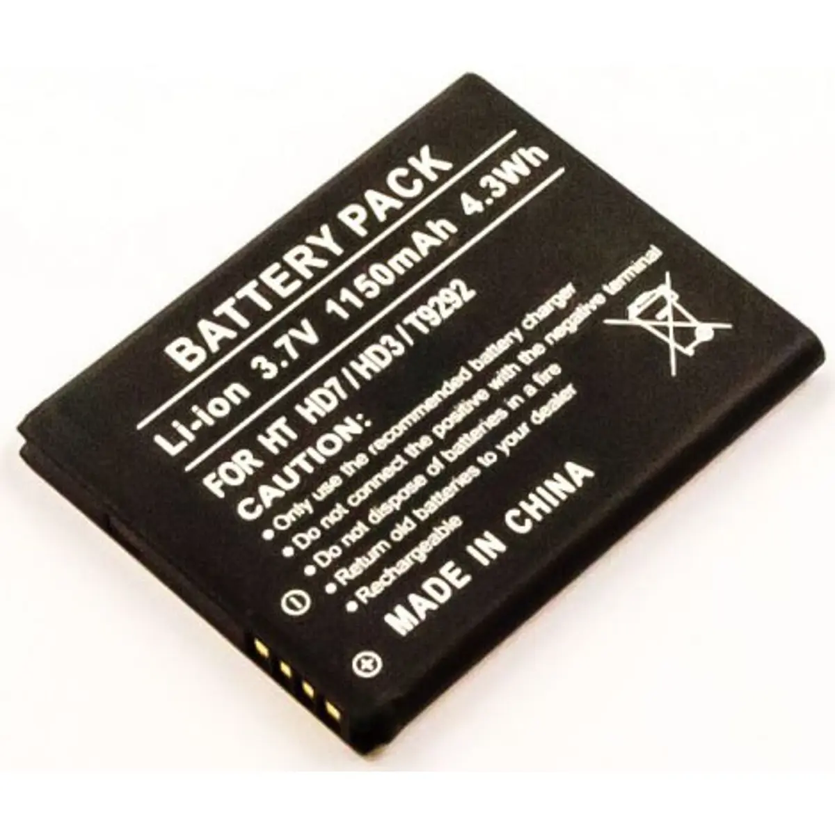 Bateria para telemóvel compatível com HTC HD7, HD3 e T9292, com célula Li-Ion de 3.7V e 1150mAh (4.3Wh). Oferece energia estável para uso diário, dimensões compactas de 53.4x43.1x5mm e peso de 25 g, facilitando substituição rápida e recargas confiáveis.